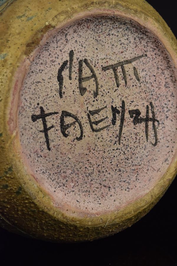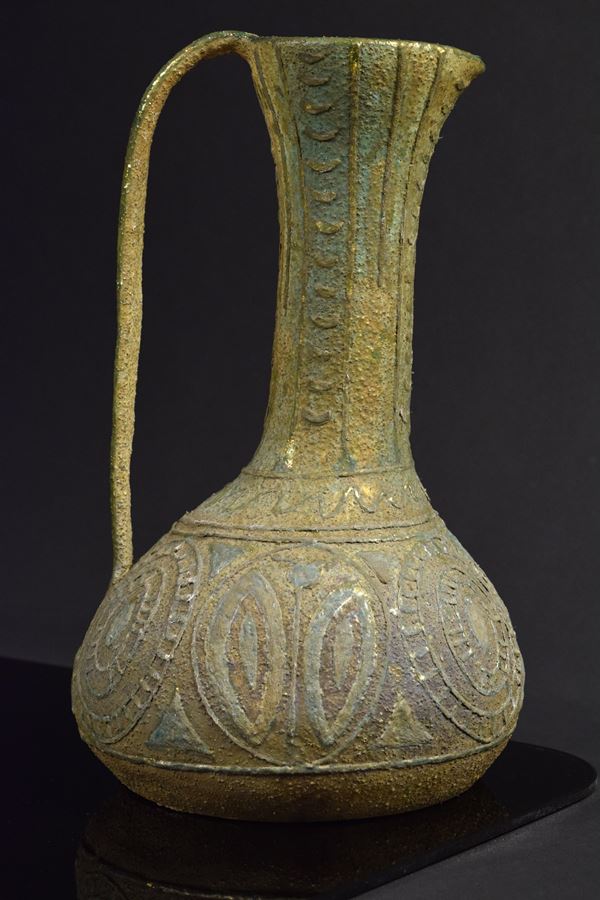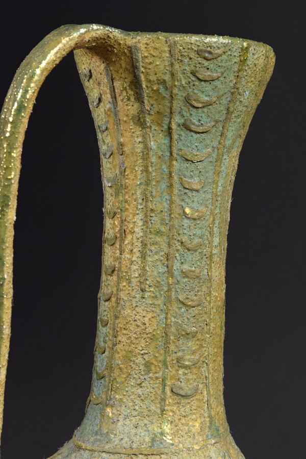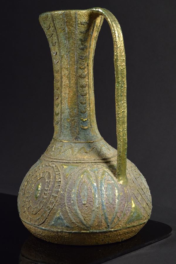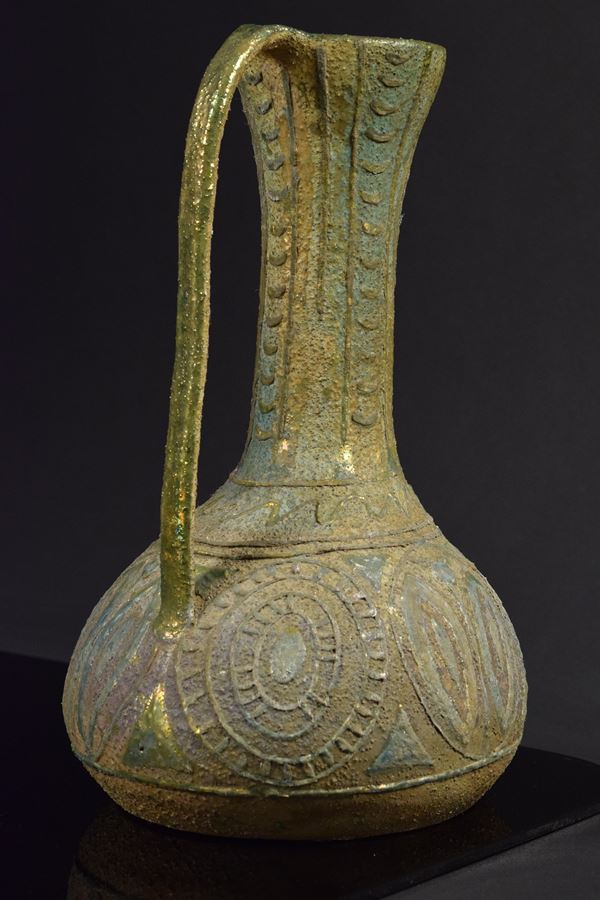 Vaso con manico in ceramica policroma con decori geometrici a rilievo riflessati.