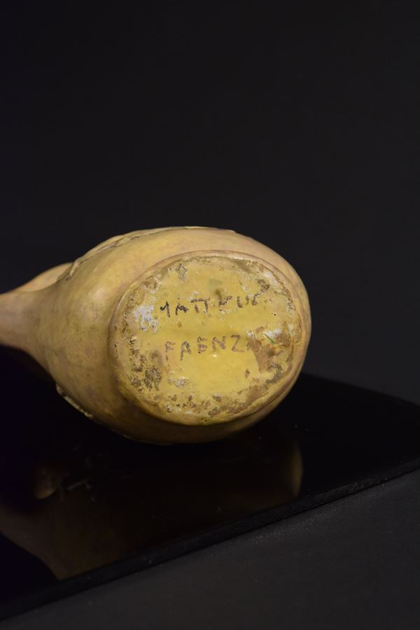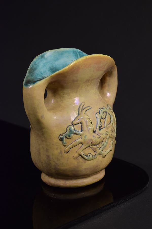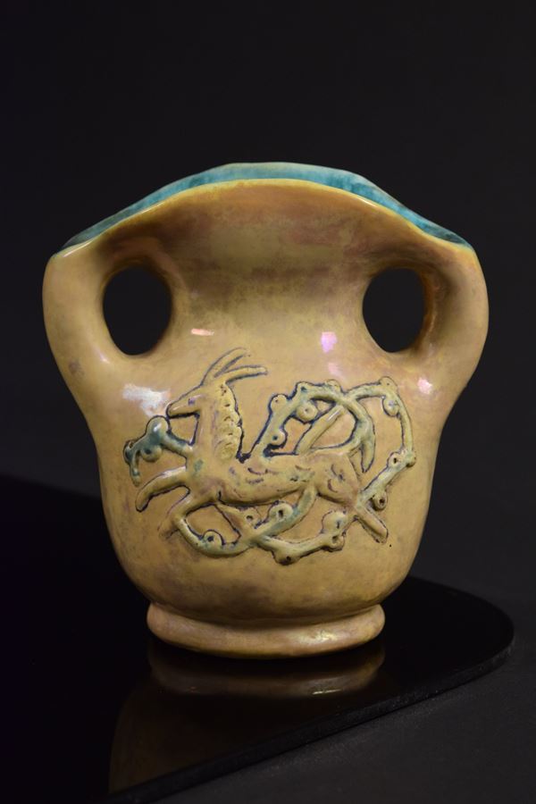 Vaso a due manici in ceramica policroma riflessata a lustro con decori di cerbiatti a rilievo presenti in entrambi i lati.