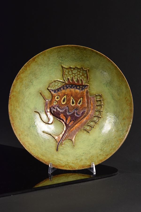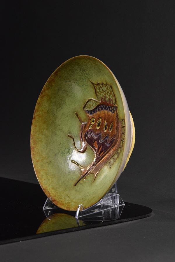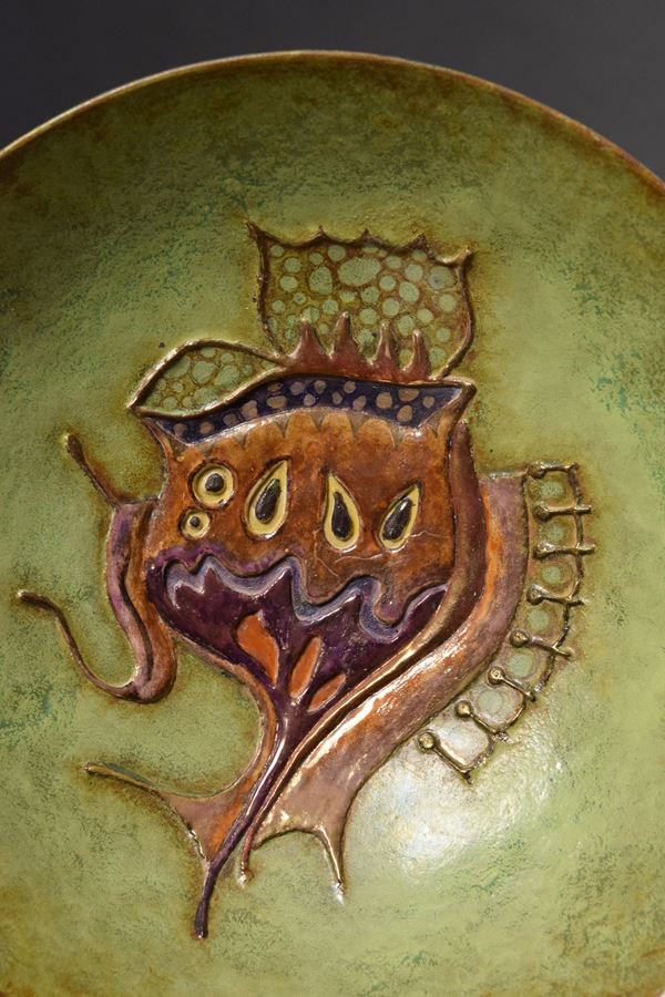 Ciotola in ceramica policroma con decori a rilievo al centro.