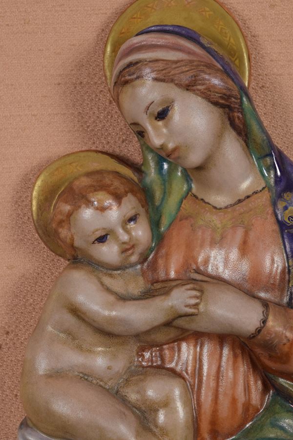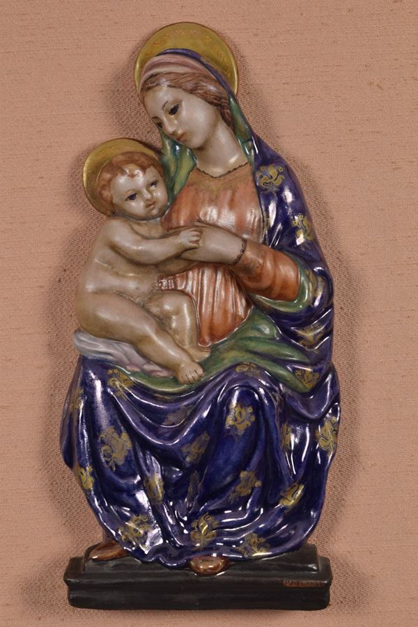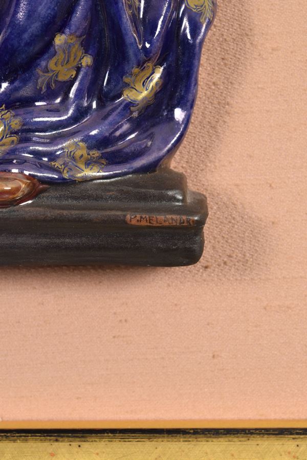Madonna con Bambino in ceramica policroma, abito finemente decorato. Entro cornice coeva.