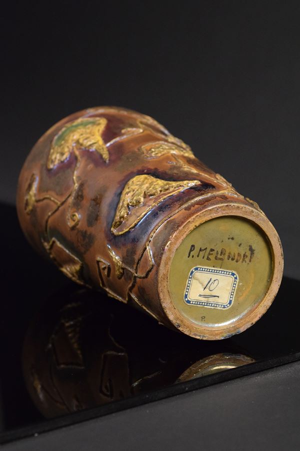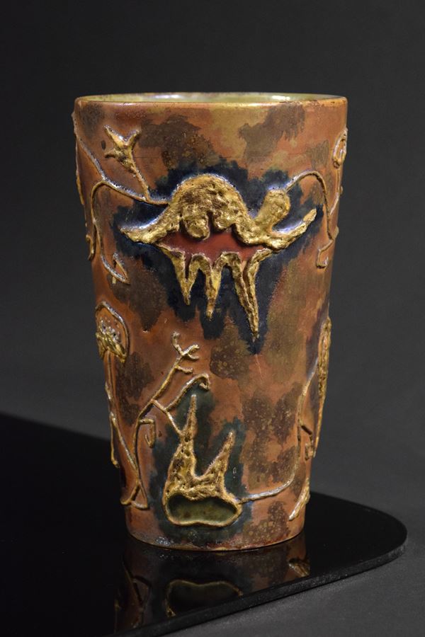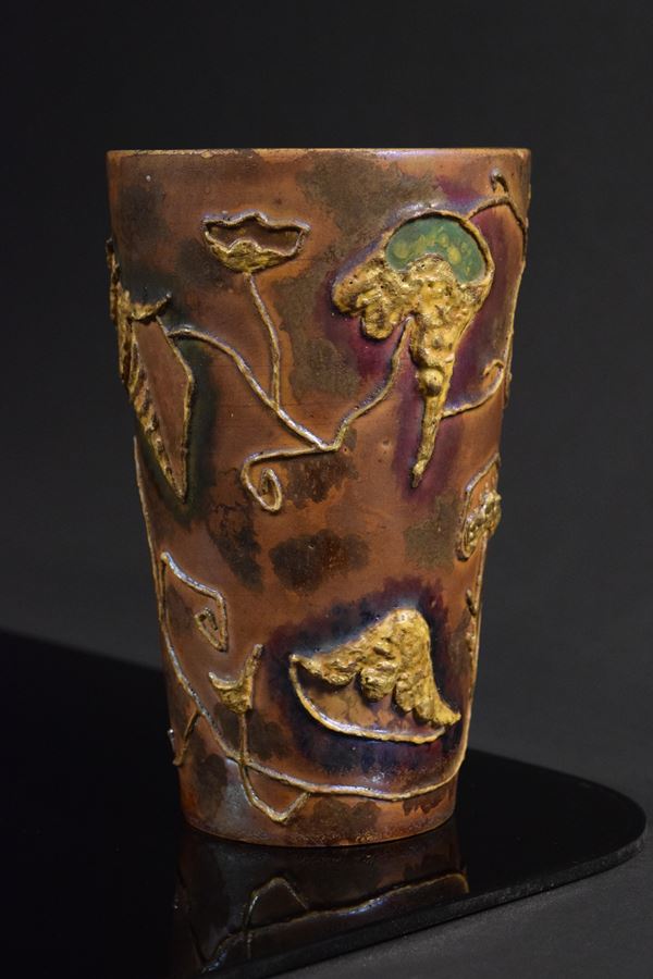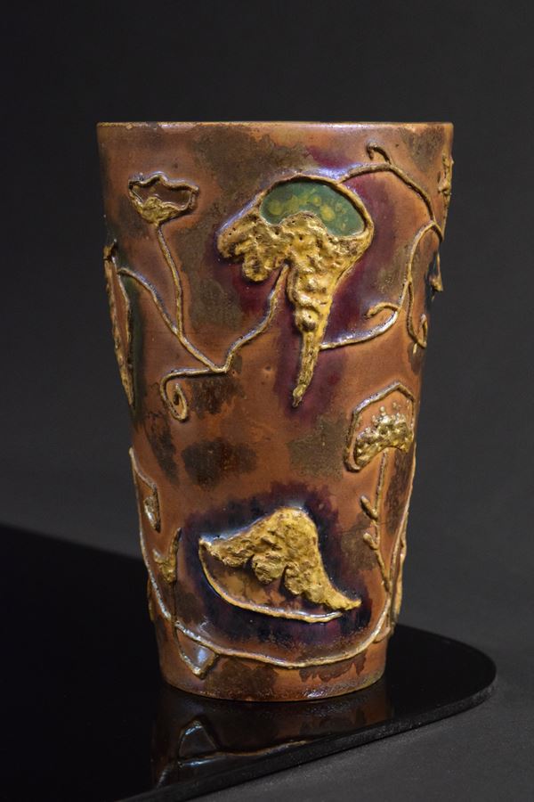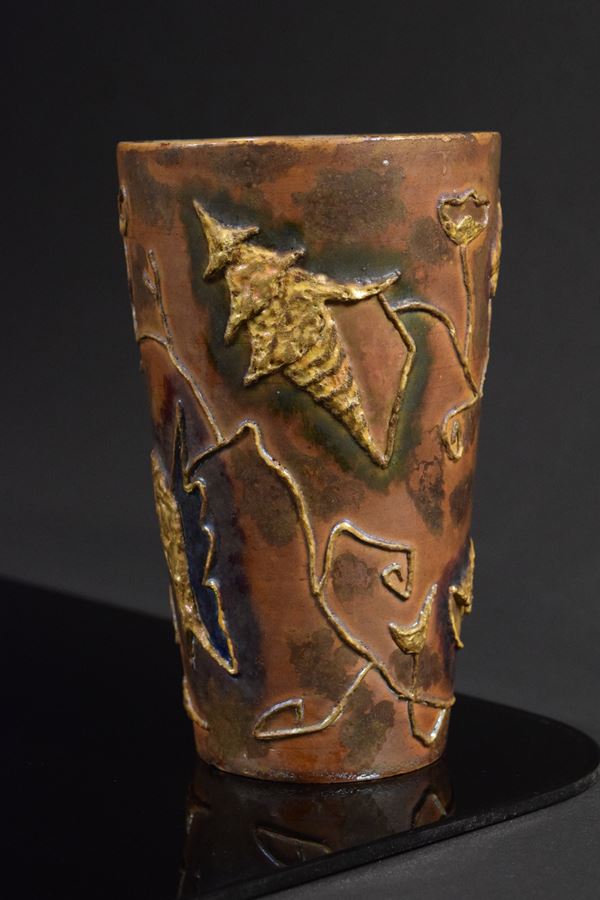 Vaso in ceramica policroma a motivi informali marittimi a rilievo. Riflessato all'interno e sotto la base.
