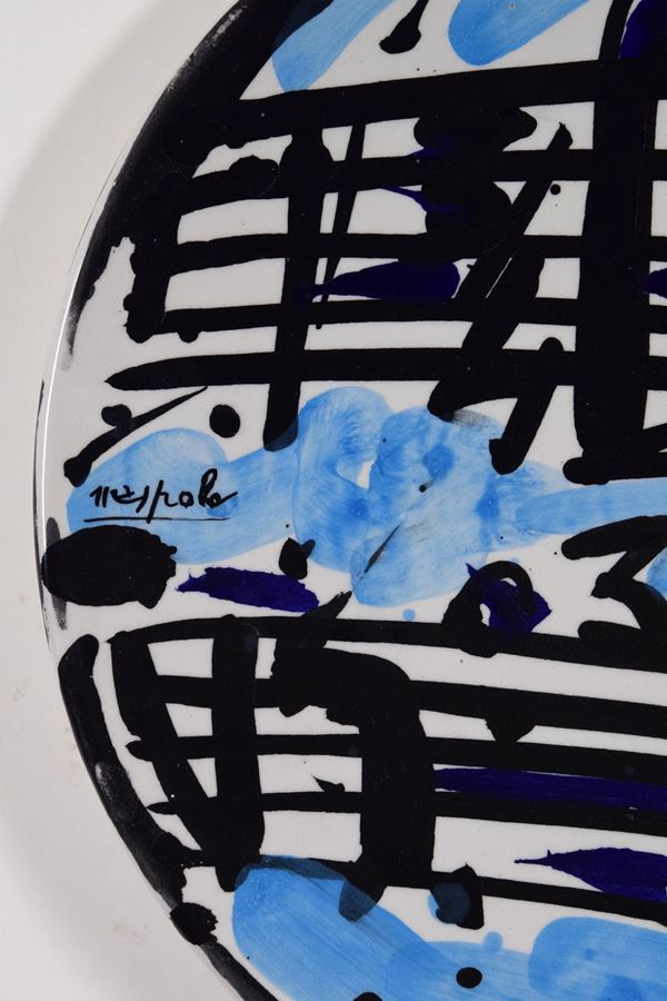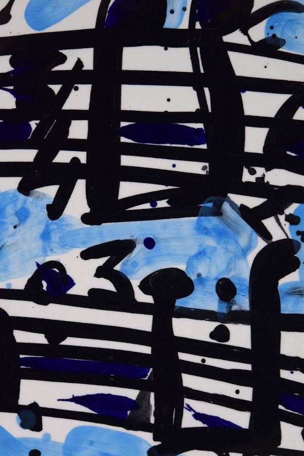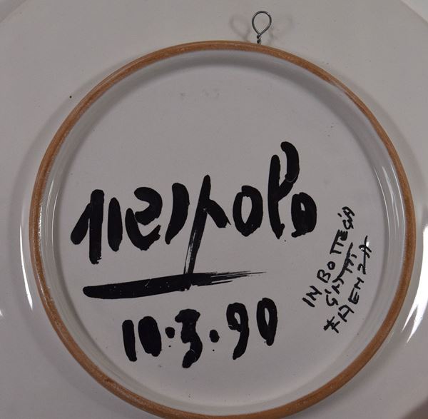 Firmato a sinistra "Nespolo". Nel retro datato 10/03/90 e firmato "Bottega Gatti Faenza".