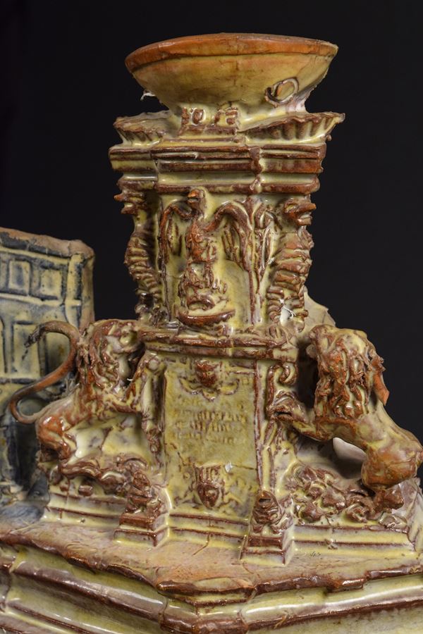 Altorilievo della Fontana Monumentale della Piazza di Faenza in ceramica policroma.