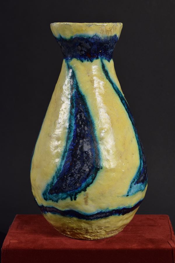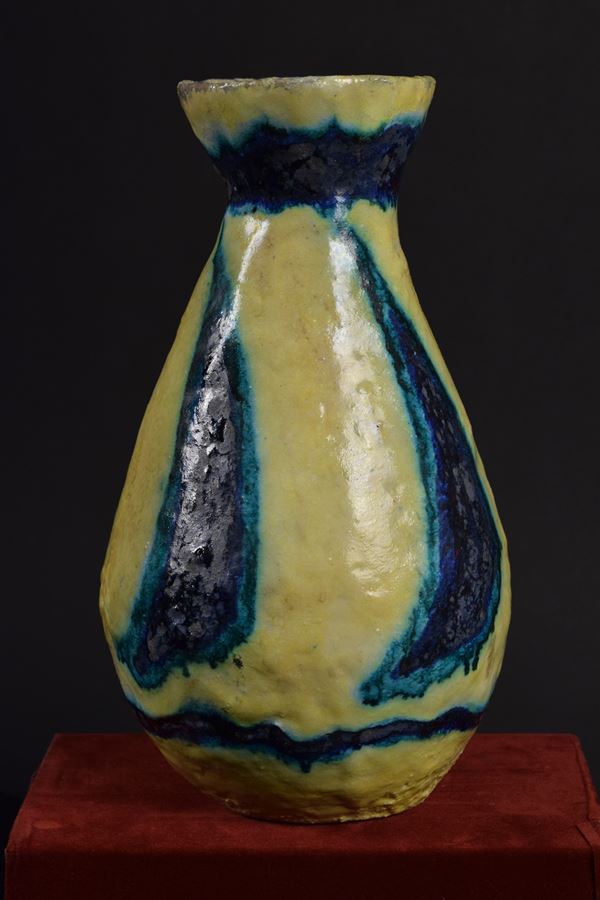 Vaso in ceramica a sfondo giallo con decori policromi.
