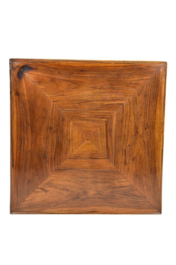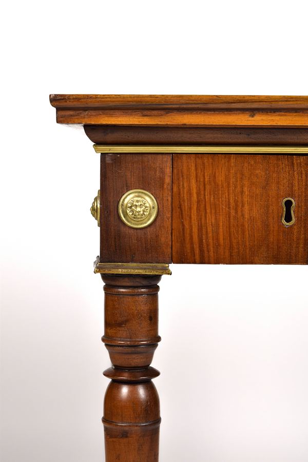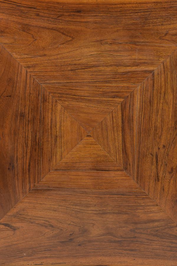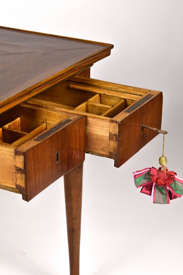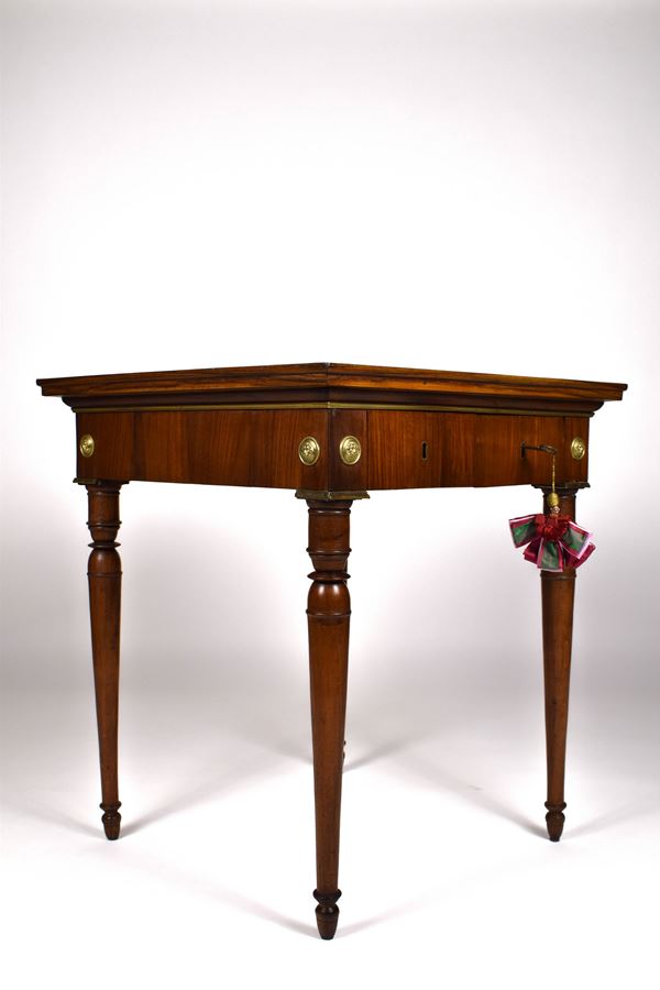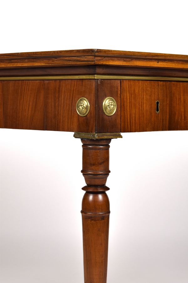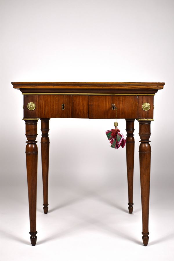 Tavolino da gioco in legno di noce quadrato con due cassettini con serratura, divisi all'interno in scompartimenti. Gambe tornite e strozzate nella parte superiore. Rifinito nella fascia sotto il piano con bronzetti tondi con testa di leone. Piano incorniciato da bordo leggermente rialzato.