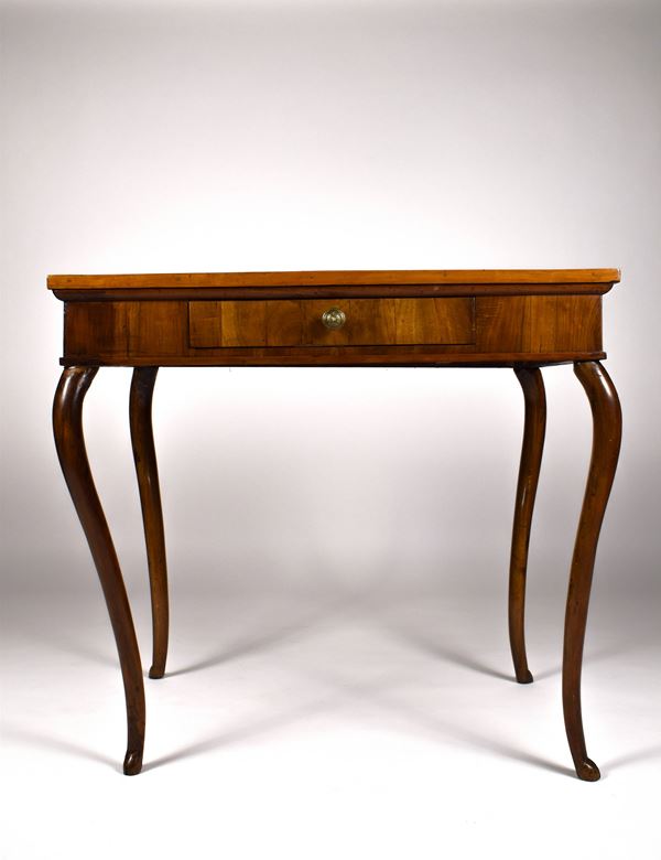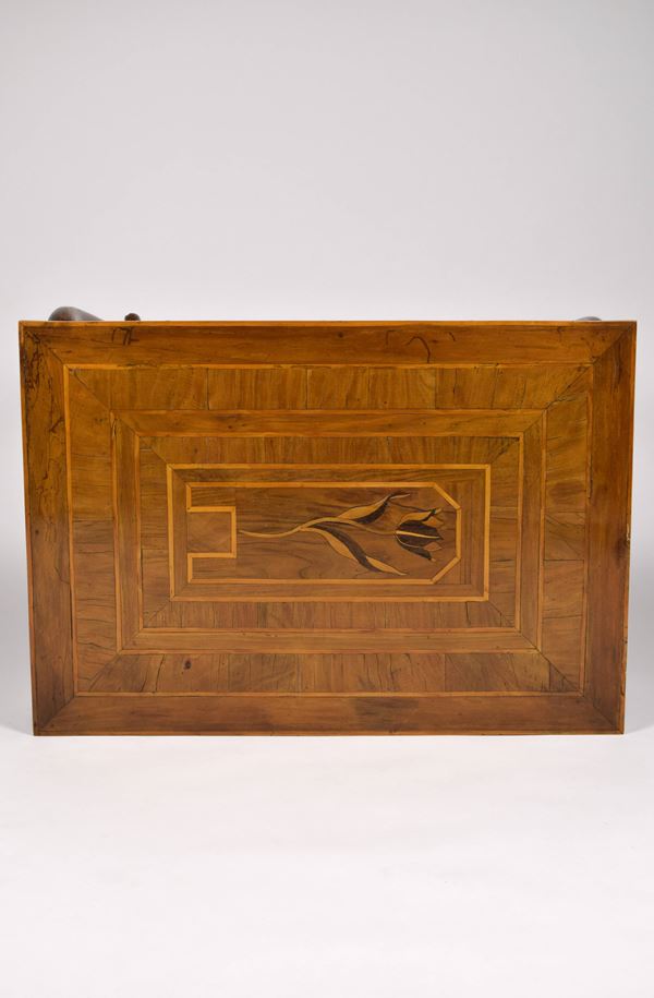 Tavolino rettangolare in legno di noce con gambe a sciabola, cassetto centrale, piano filettato con al centro tulipano intagliato a legni vari.