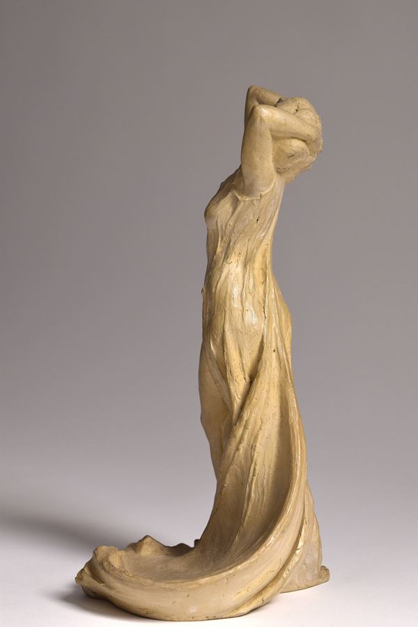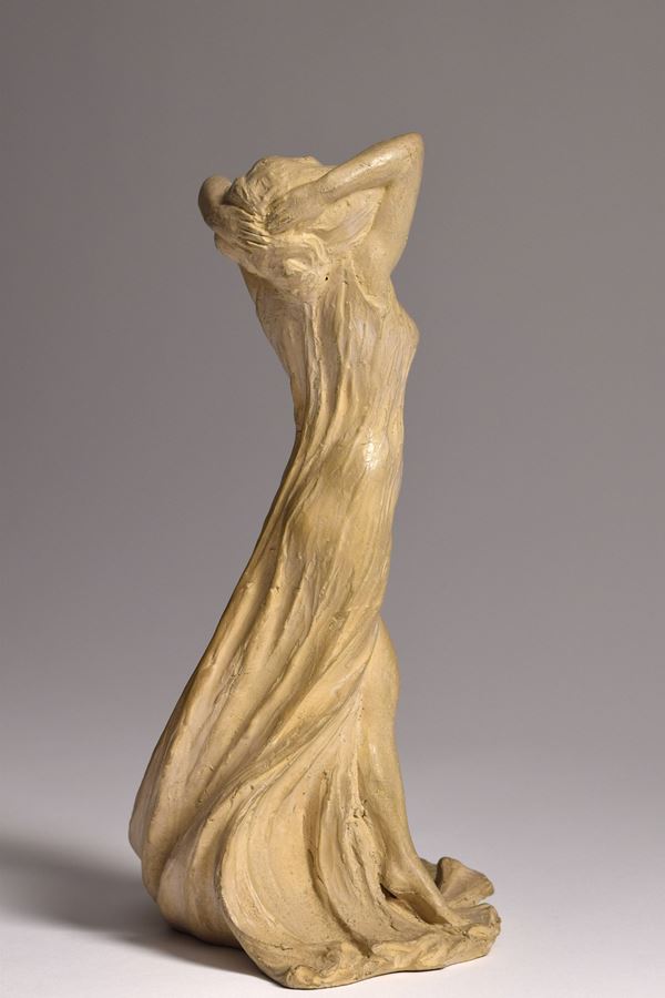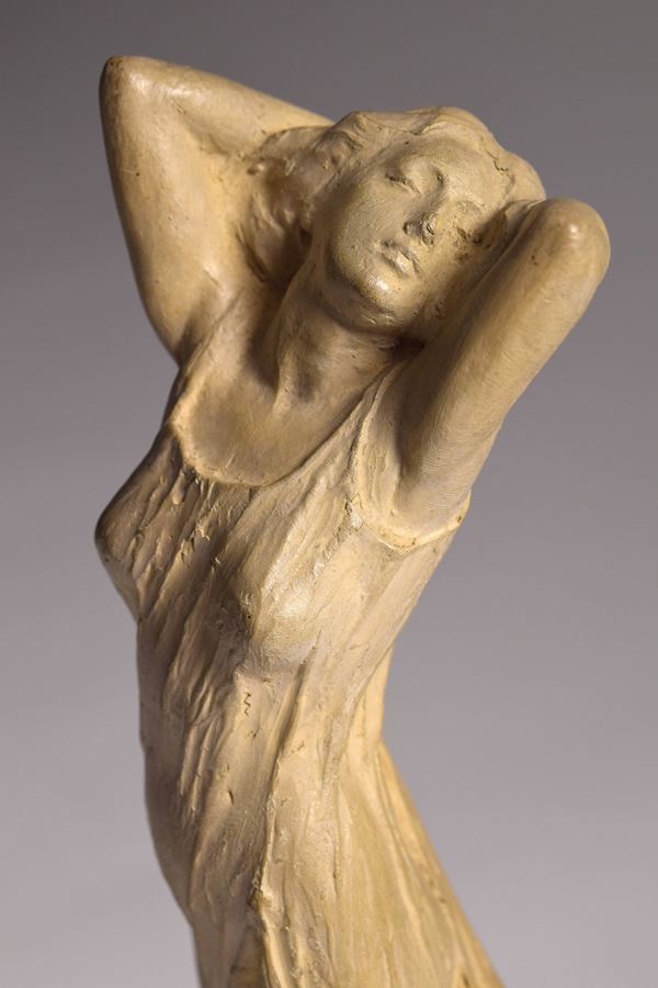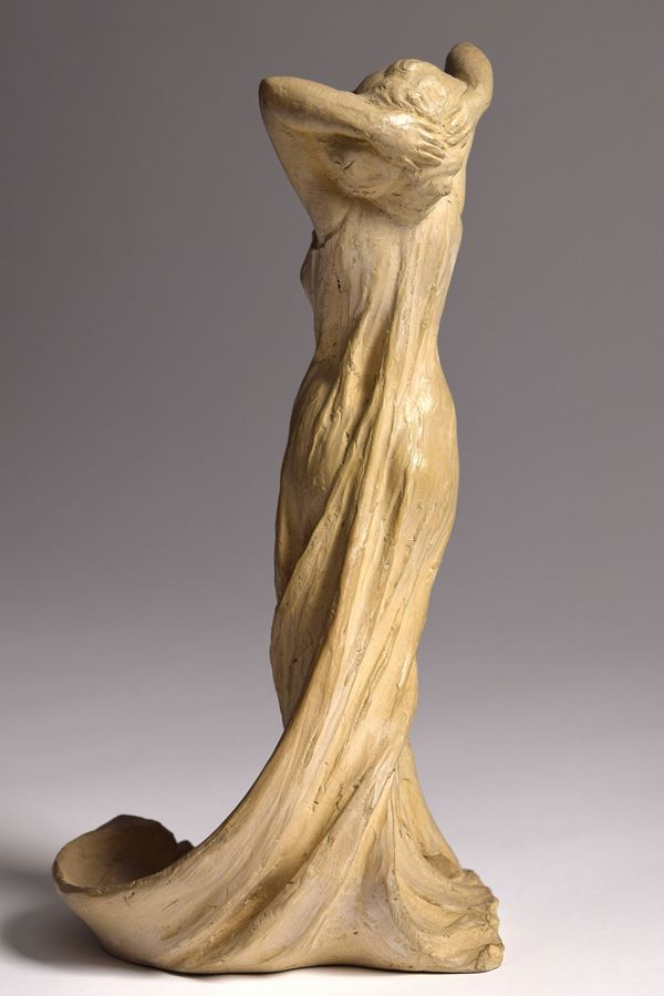 Portagioie con figura femminile danzante in terracotta patinata da un modello di Domenico Baccarini del 1903. Le forme e i segni impressi dallo stampo, il tipo di terra usata lasciano supporre che l'opera sia stata realizzata nei primi anni del '900.