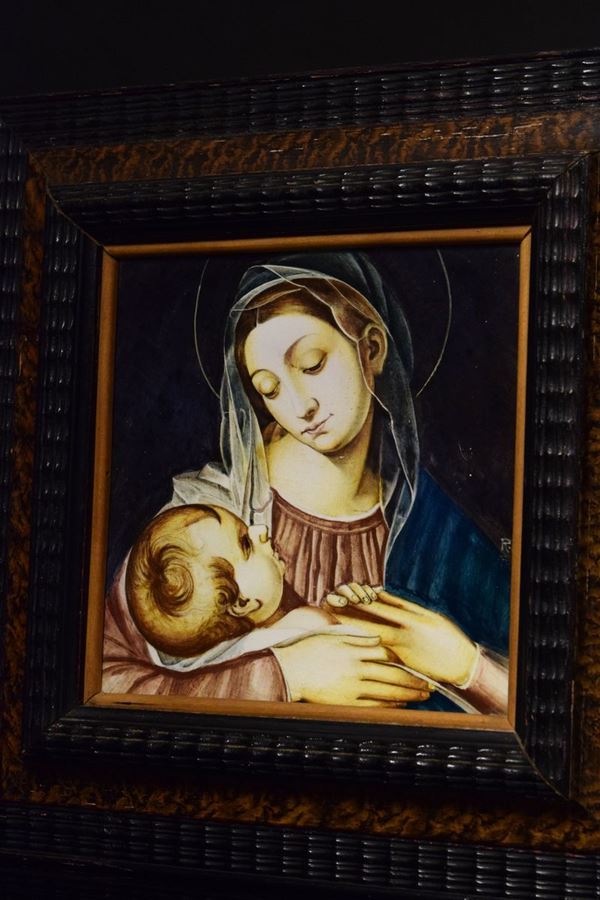 Piastra in maiolica policroma dipinta di Madonna con Bambino. Entro cornice in legno trottata e radica.
