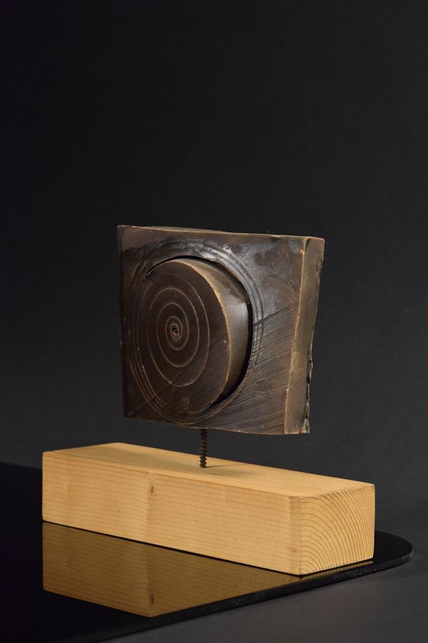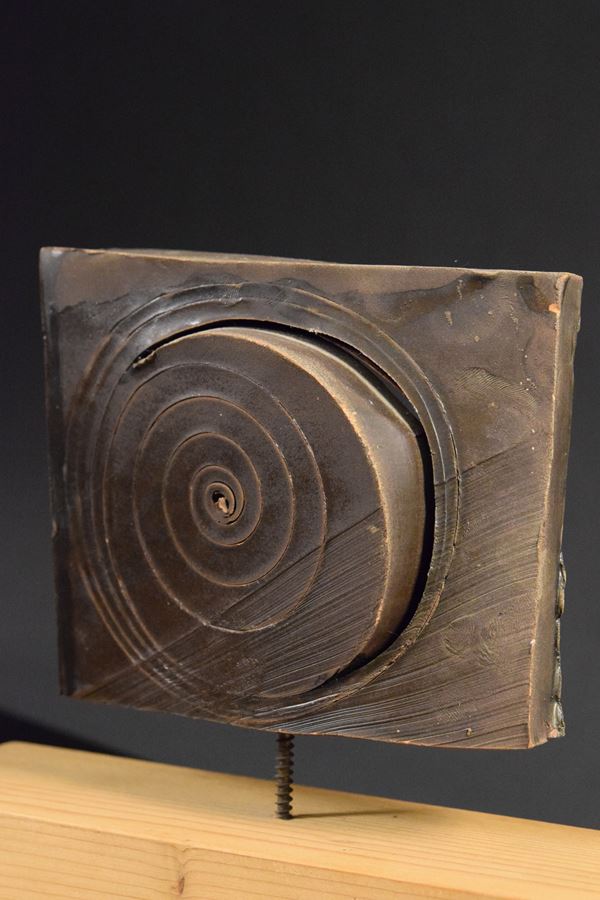 Terracotta di forma geometrica smaltata opaca con motivo a spirale inciso sul fronte. Montata su base in legno originale Leoni.