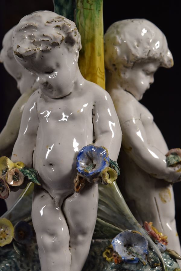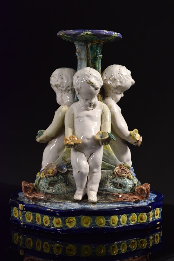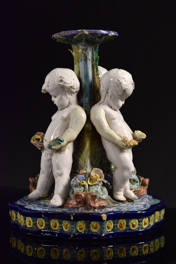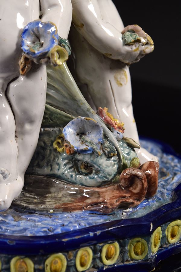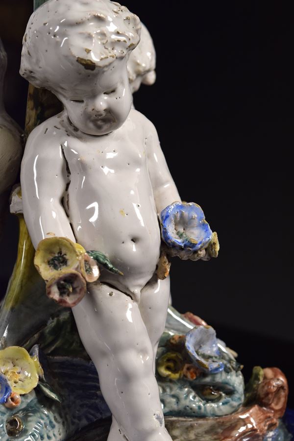 Centrotavola in ceramica policroma con putti, pesci, fiori e motivi vegetali.