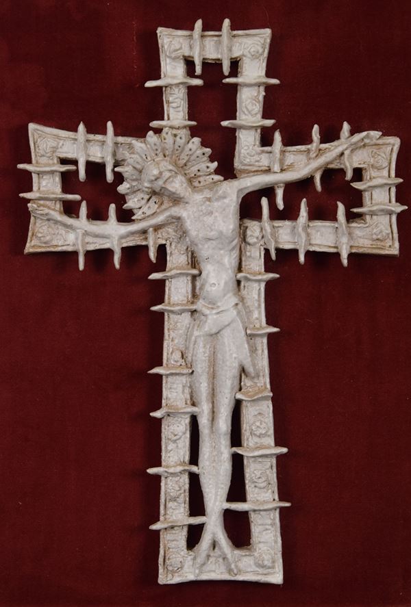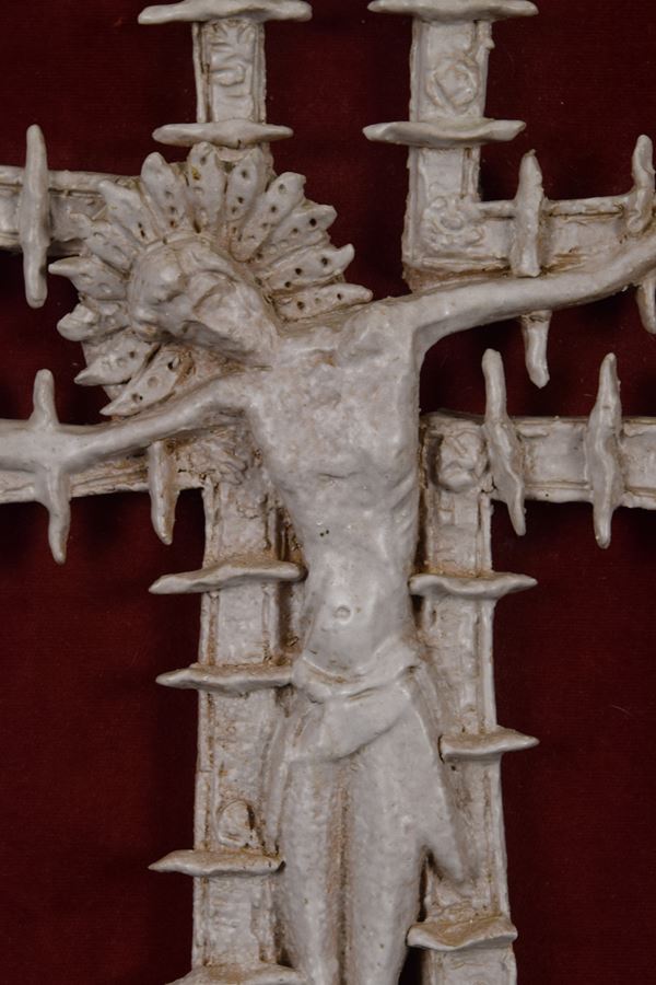 Crocifisso in ceramica monocroma. Montato su pannello in velluto con cornice. Piccola mancanza