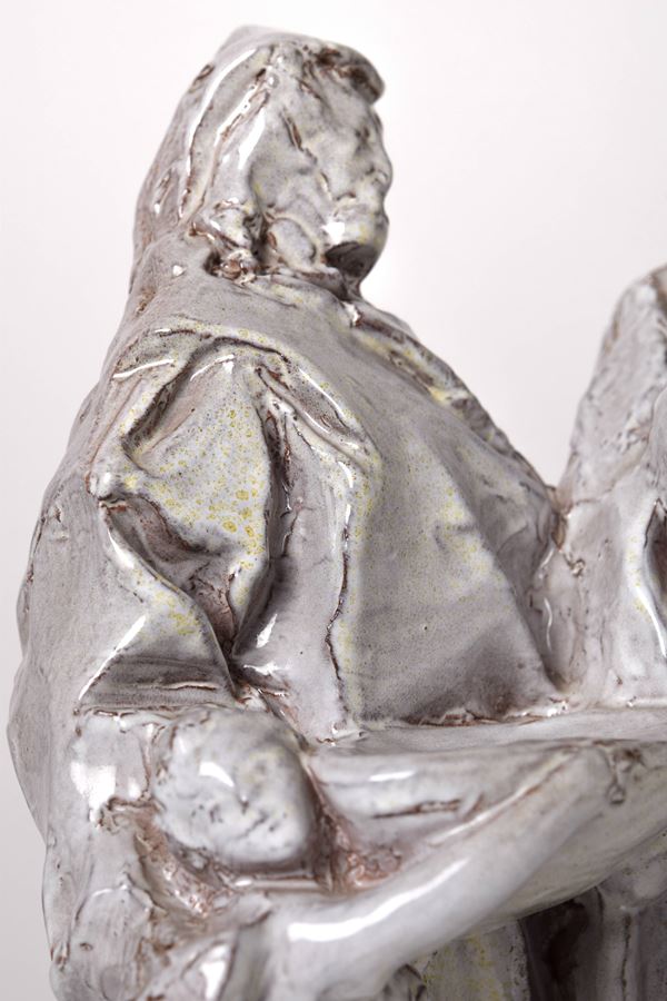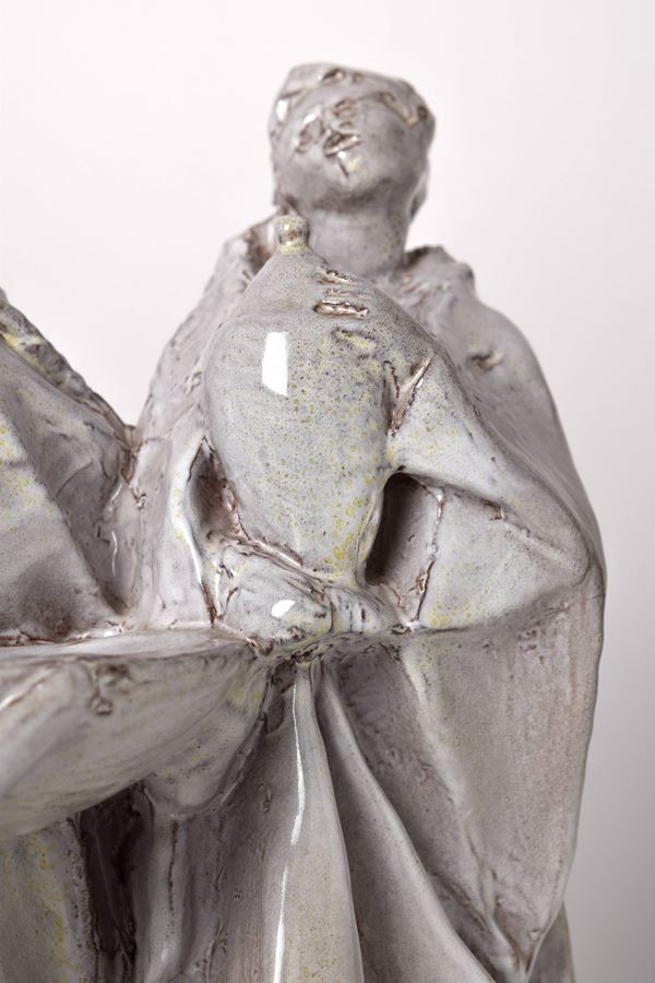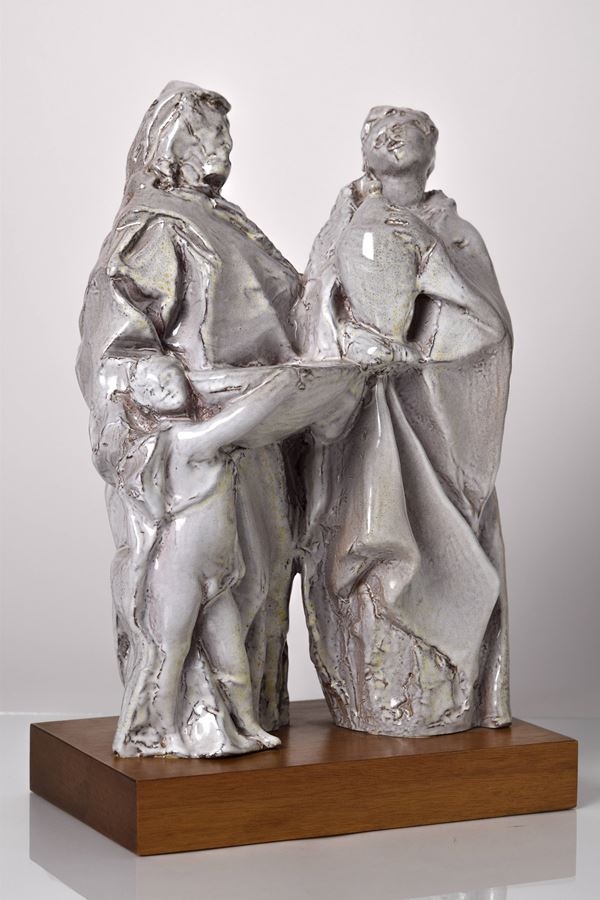 Scultura a tutto tondo in ceramica monocroma a tre figure su base di legno coeva.