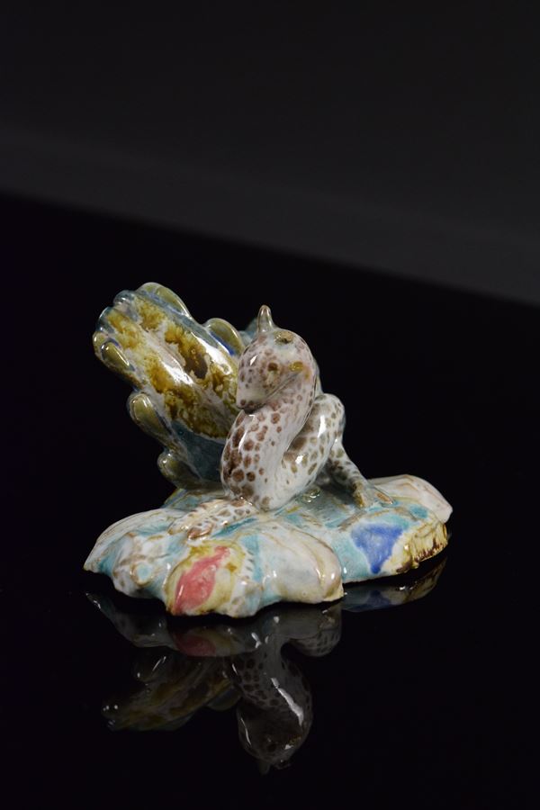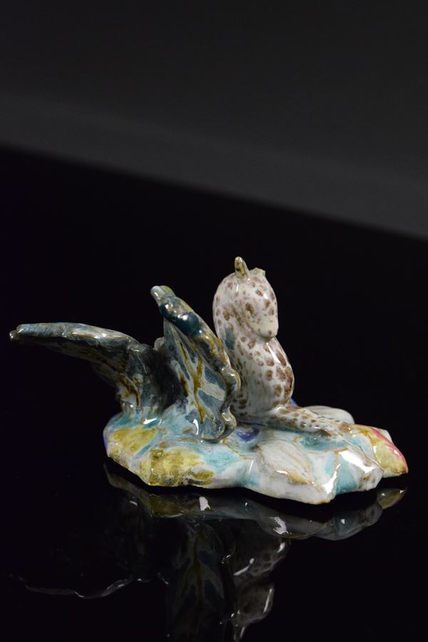 Animaletto fantastico in ceramica policroma modellato a mano facente parte della composizione de "Il Mito di Orfeo".