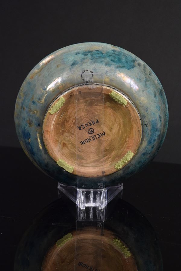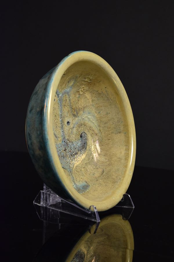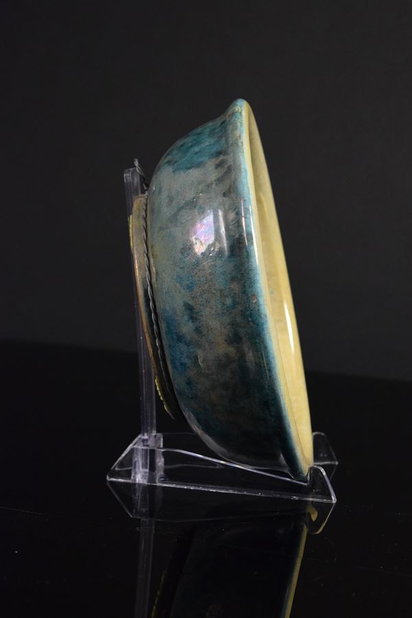 Ciotola in ceramica policroma riflessata all'acido a bordi alti con vaso e fiori stilizzati al centro in bassorilievo.
