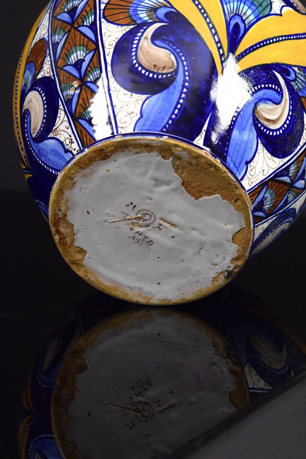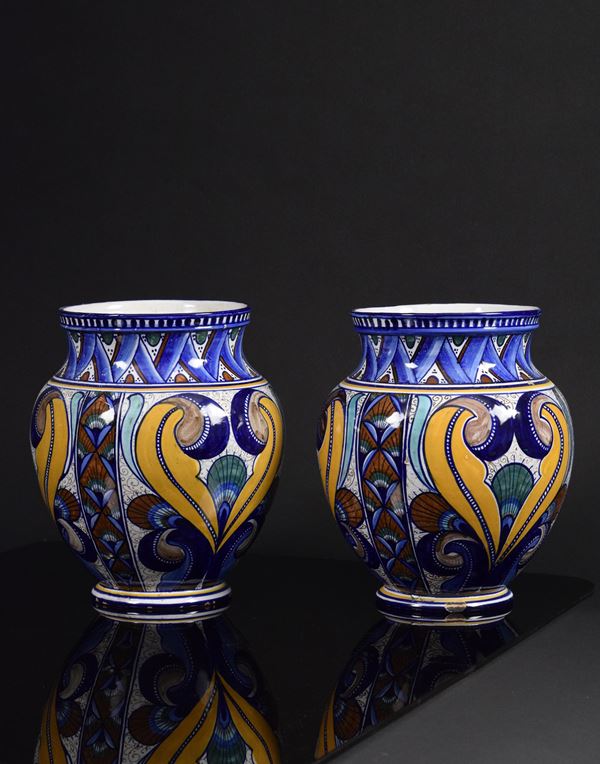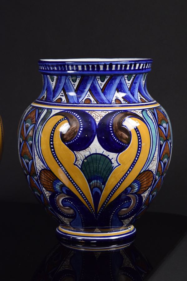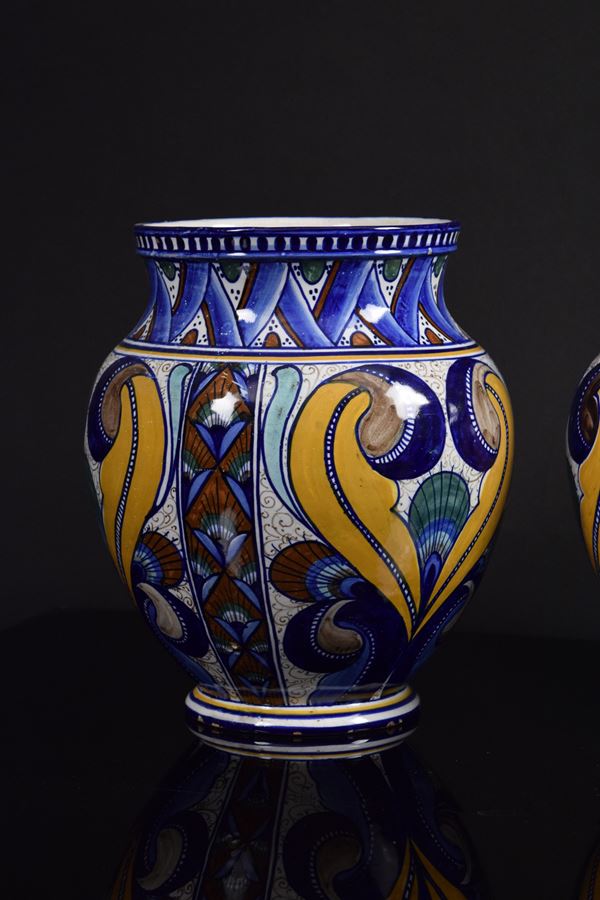Coppia di vasi in ceramica policroma con decoro "a Pavona" rivisitata dal Maestro.