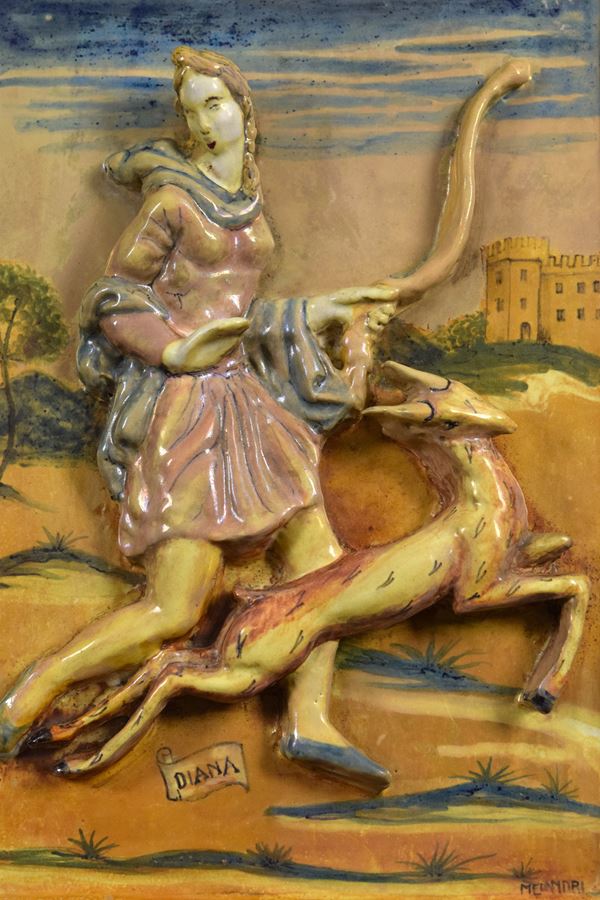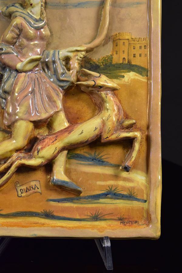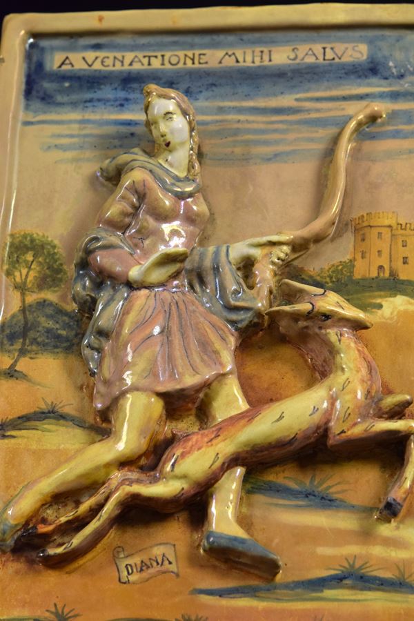 Pannello in ceramica policroma con Diana cacciatrice ad altorilievo, sfondo dipinto con castello ed alberi. Presente un cartiglio con la scritta "Diana" e in alto al centro la scritta in latino "A VENATIONE MIHI SALUS".