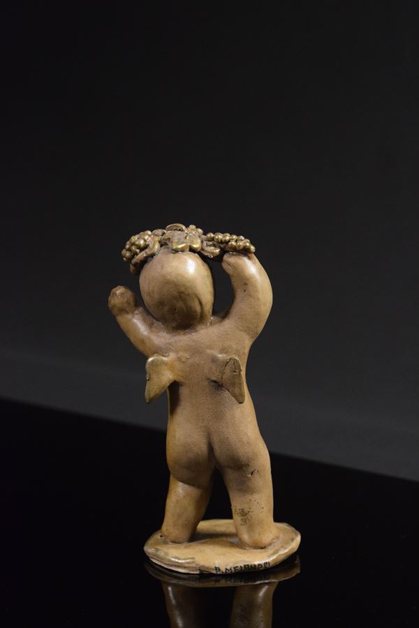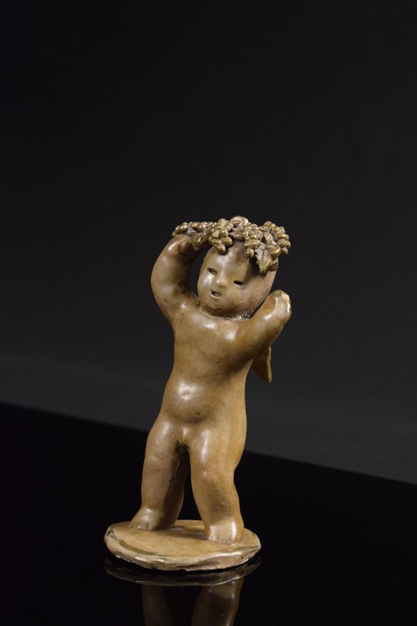 Bacchino in ceramica monocroma modellato a mano e a "tutto tondo" con uva in testa e braccia alzate, piccole ali sul retro.