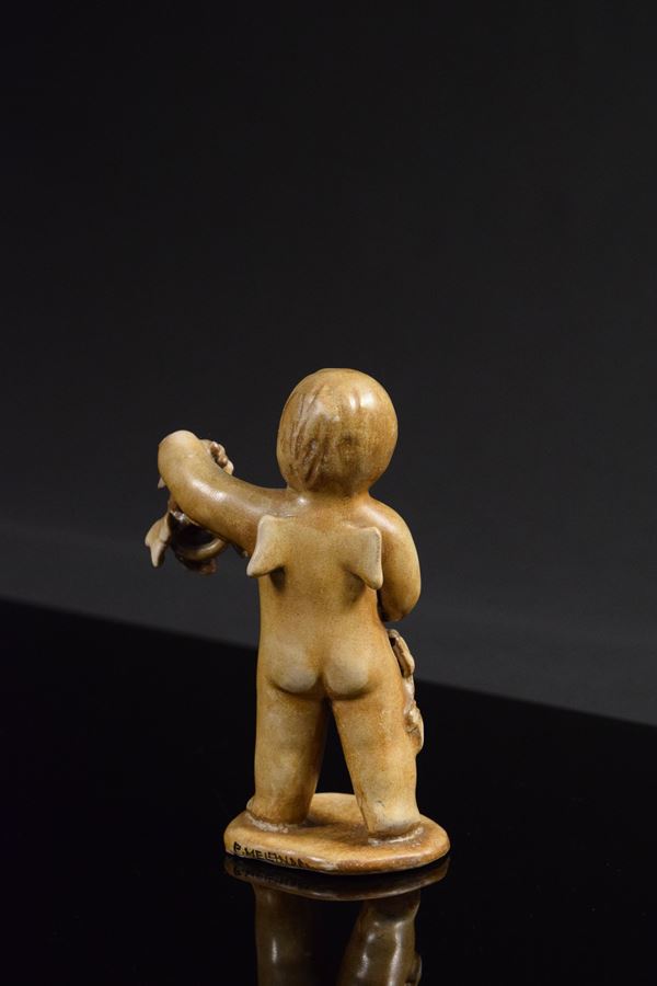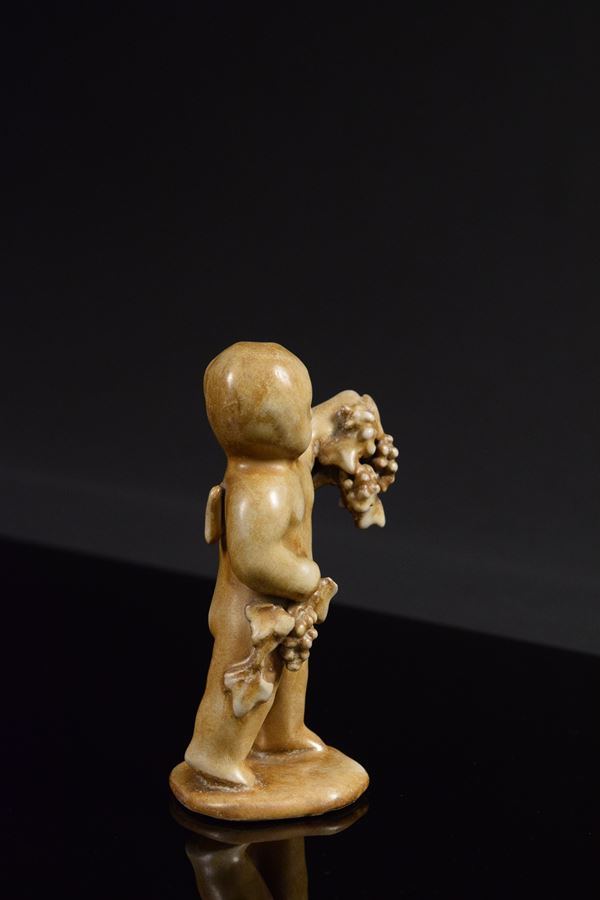 Bacchino in ceramica monocroma modellato a mano a "tutto tondo" con grappoli di uva nelle mani, piccole ali nel retro.