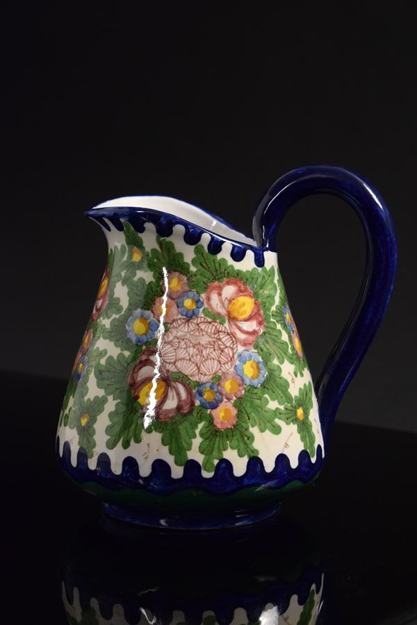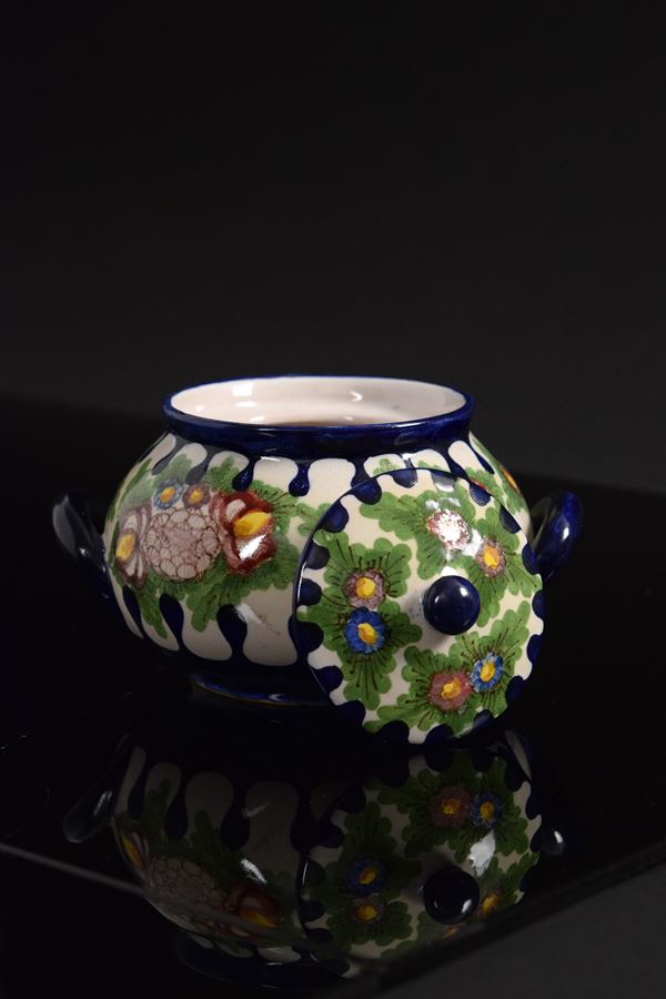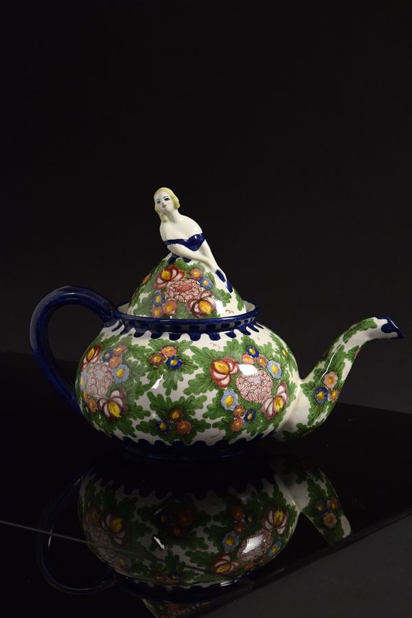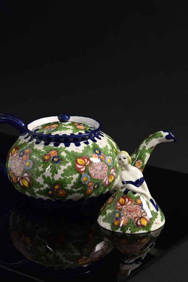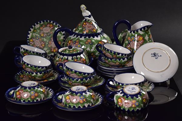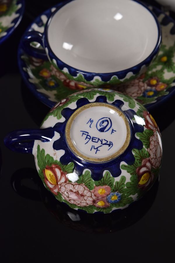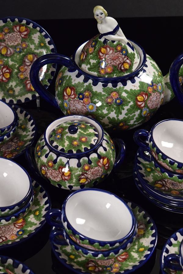 Servizio da thè in ceramica policroma dipinto a motivi floreali composto da 12 tazzine con piattino, zuccheriera, lattiera e importante teiera corredata di copri coperchio a damina modello Francesco Nonni.
