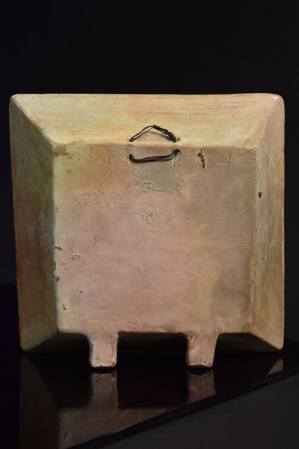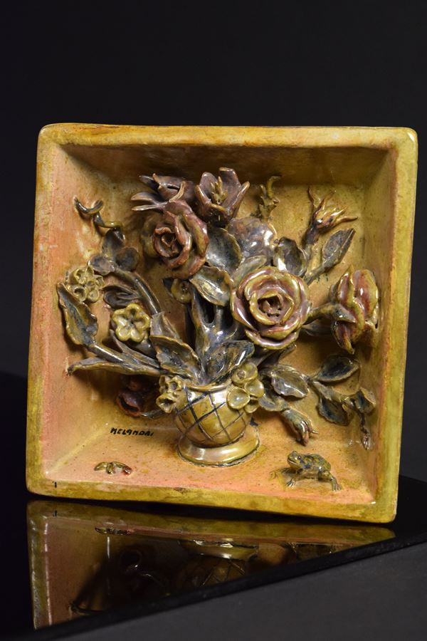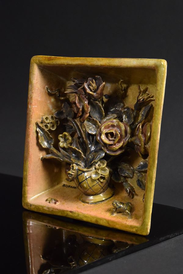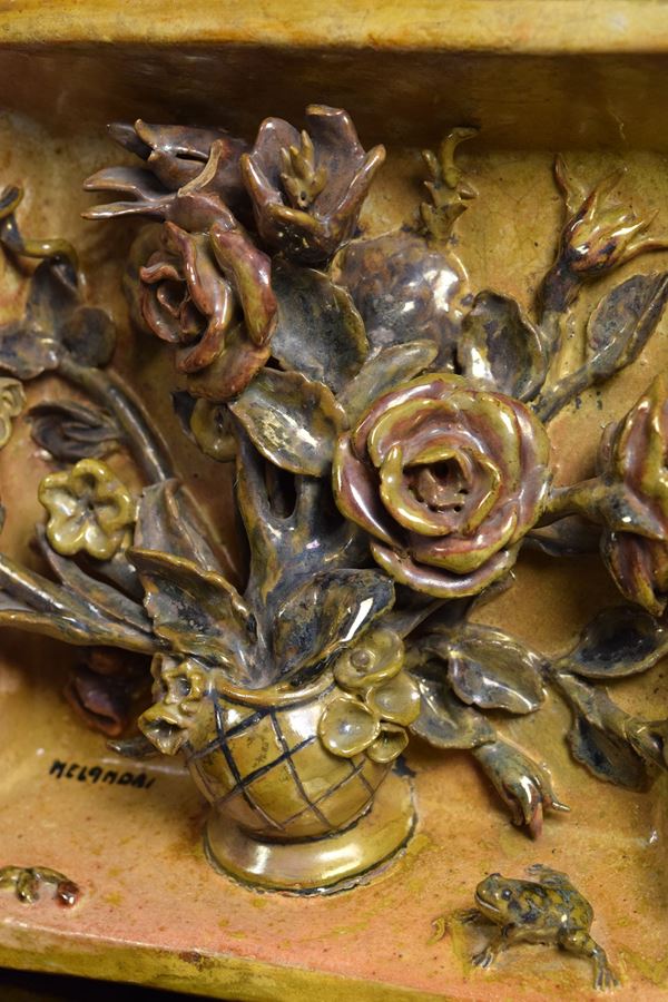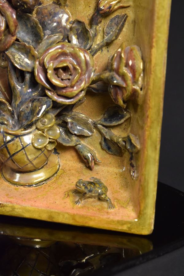 Vassoio con vaso di fiori applicati e ranocchia in basso a destra. Piedini di supporto nel retro.