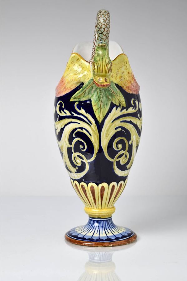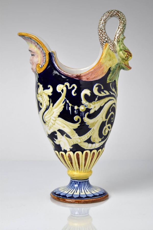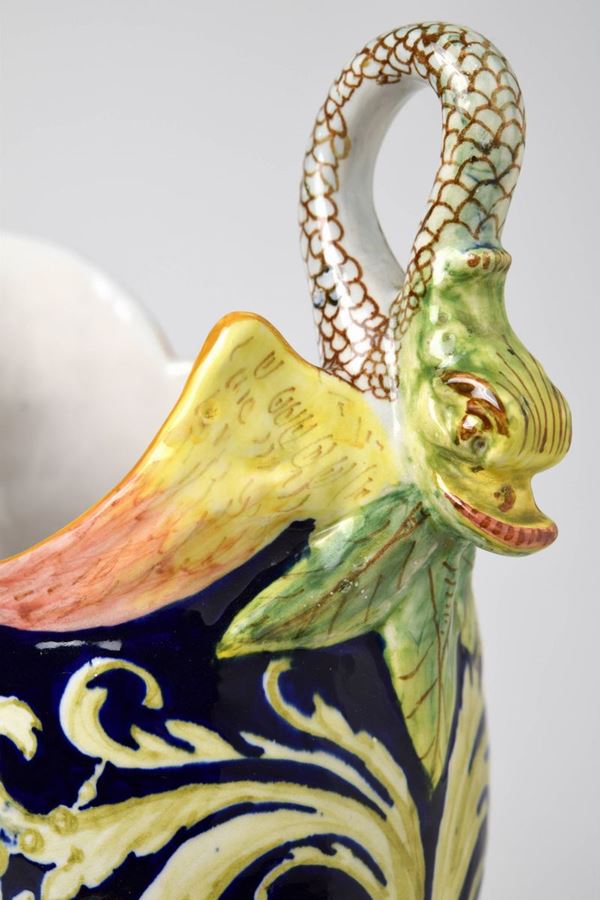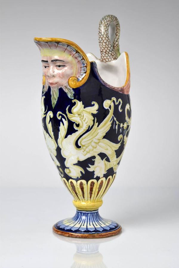 Ceramica policroma con decori classici, manico a draghetto e mascherone sul fronte.