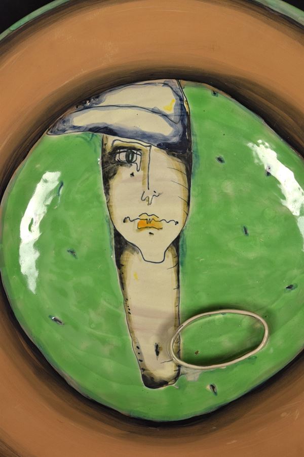 Piatto a tesa larga in terracotta, cavetto maiolicato con al centro viso di donna e applicazione.