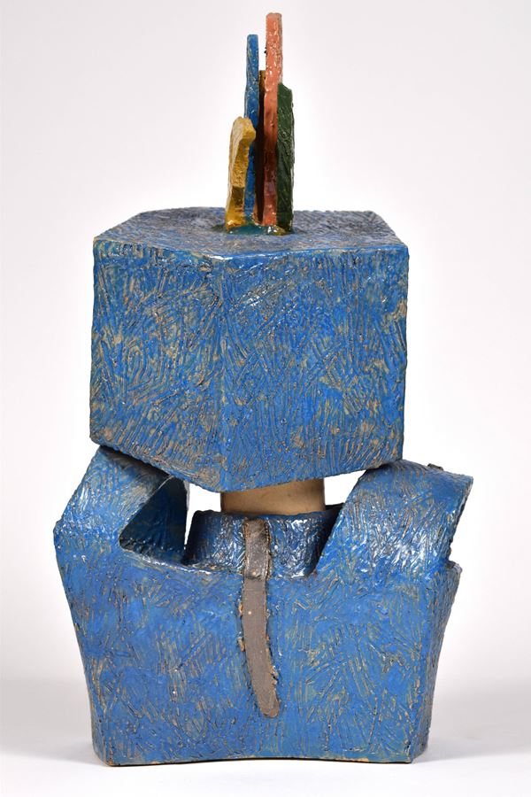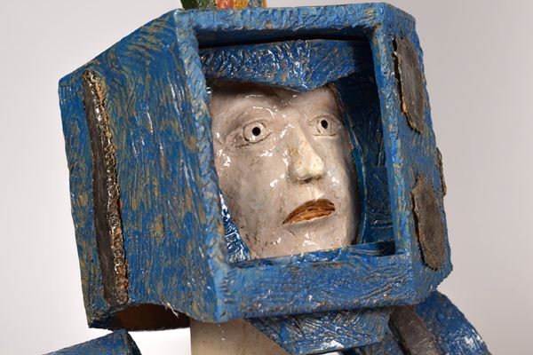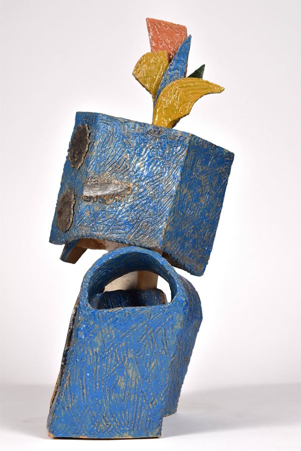 Scultura in ceramica policroma, modellata a tutto tondo con la tecnica detta "della lastra" e successivamente graffita.