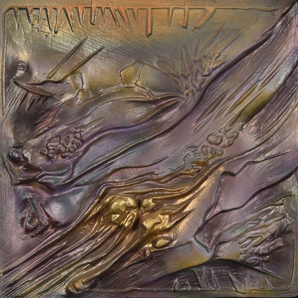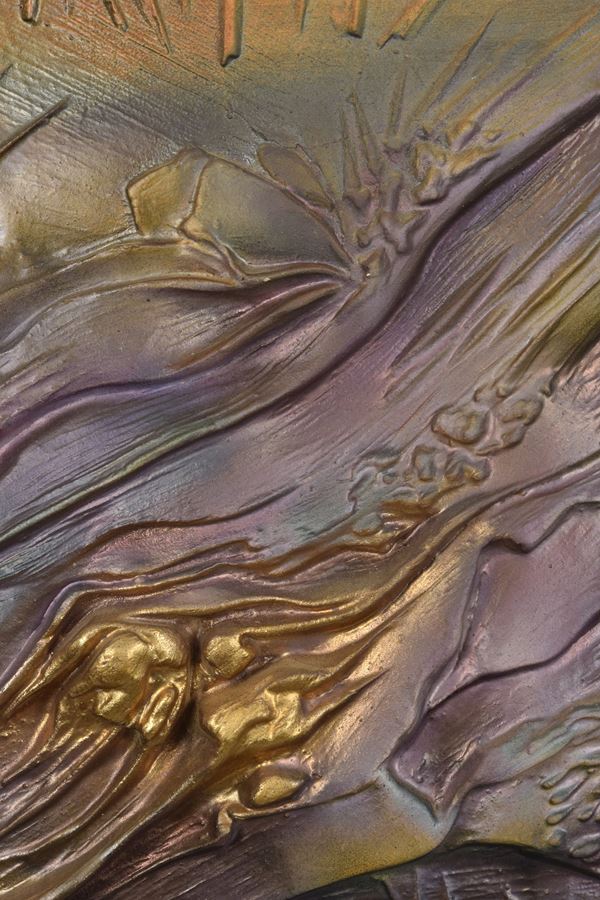Pannello dinamico in ceramica policroma lumeggiato in oro. Entro cornice.