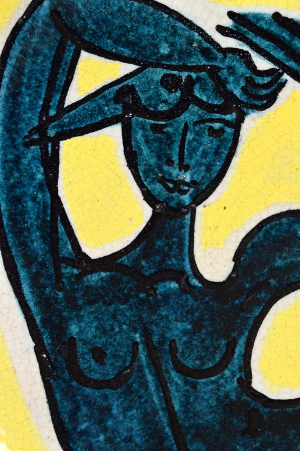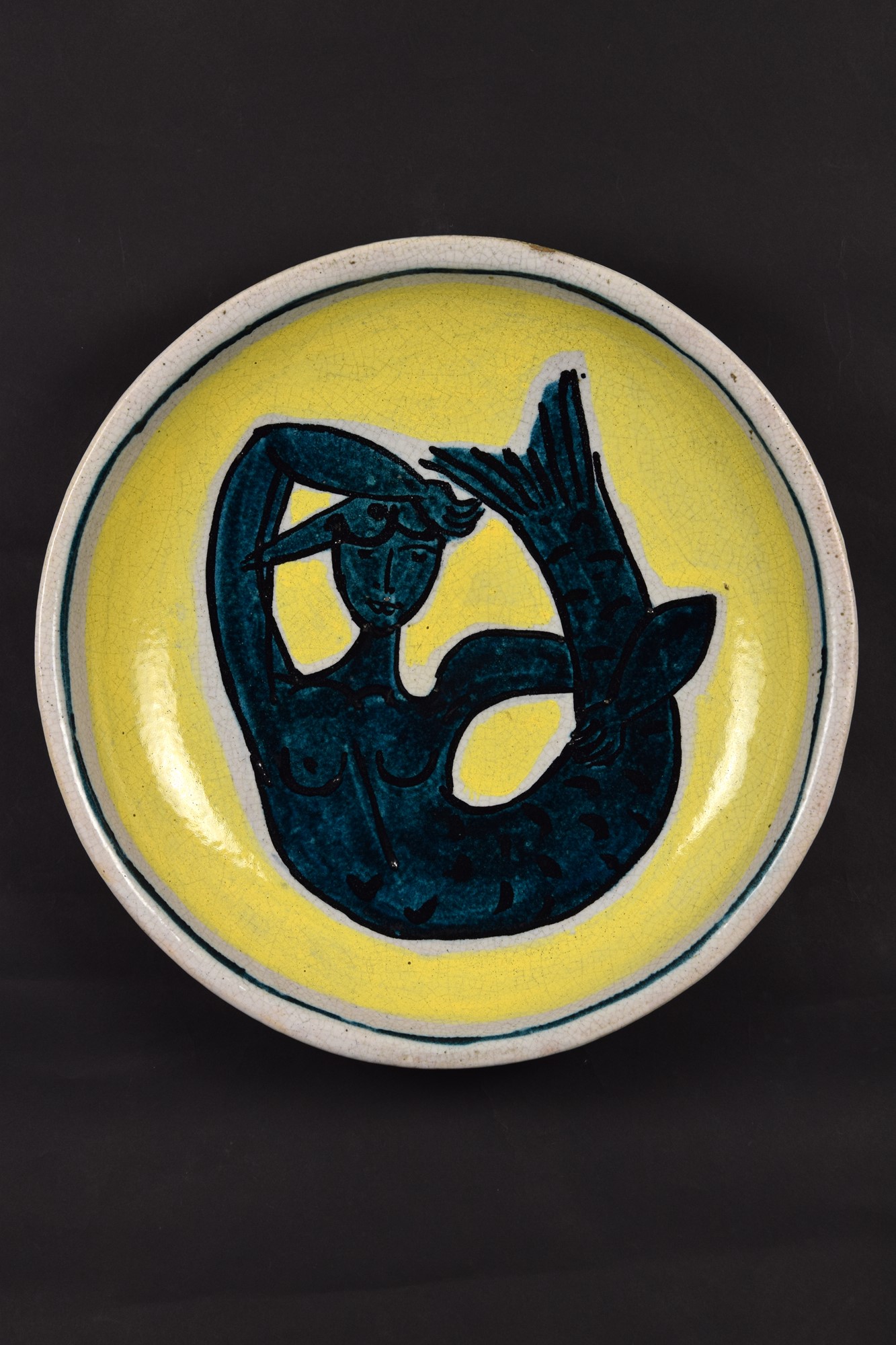 Grande piatto tondo in ceramica policroma con sirena al centro.