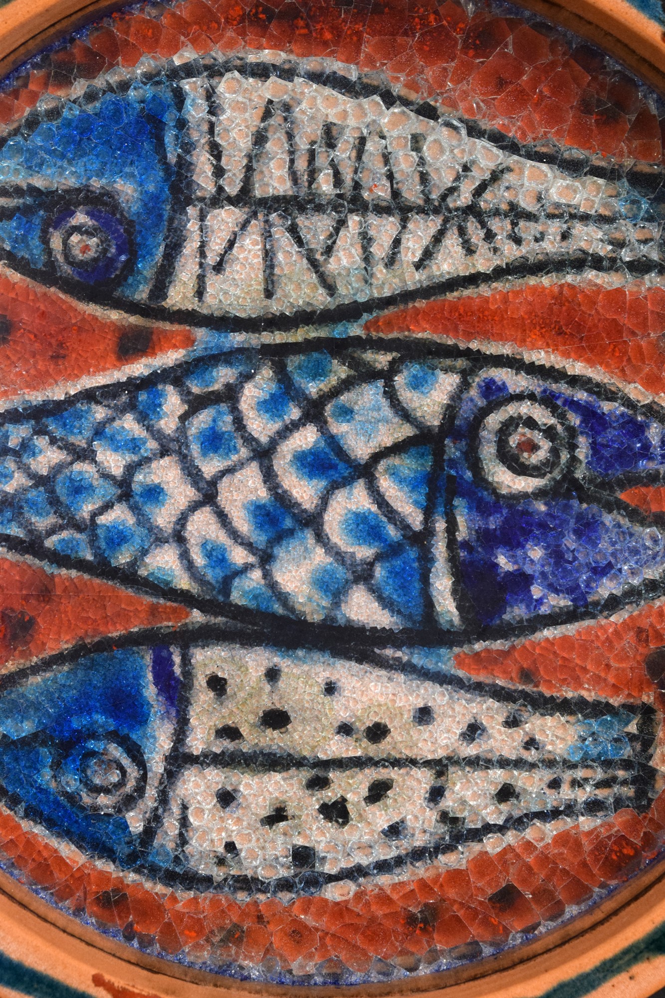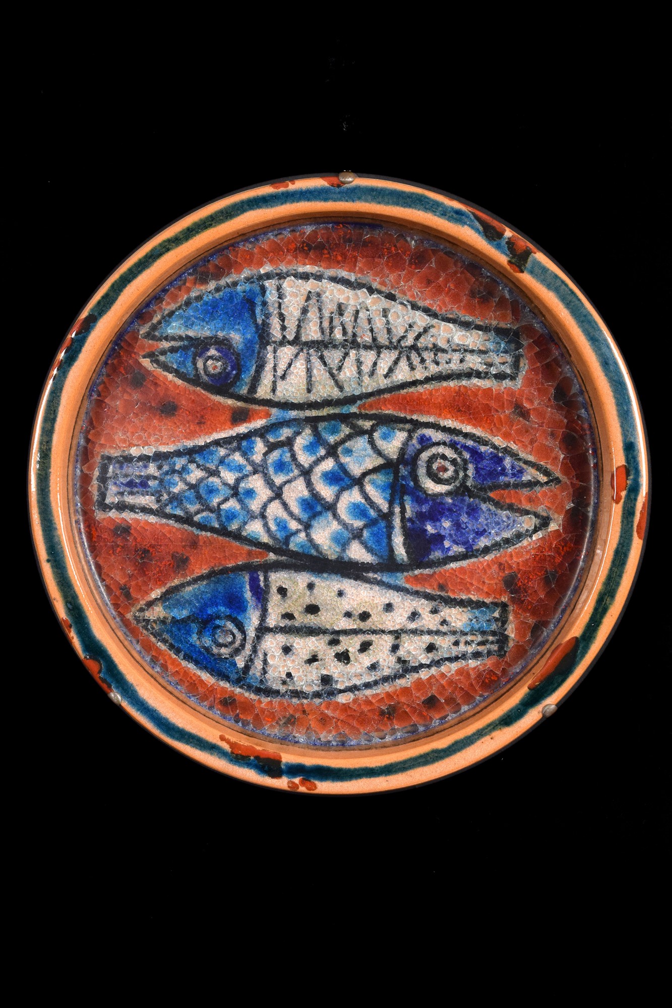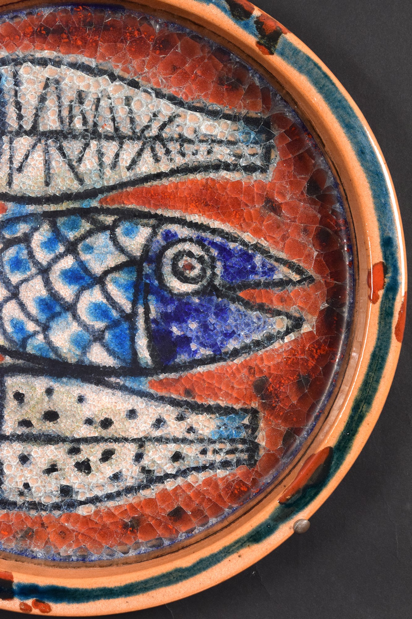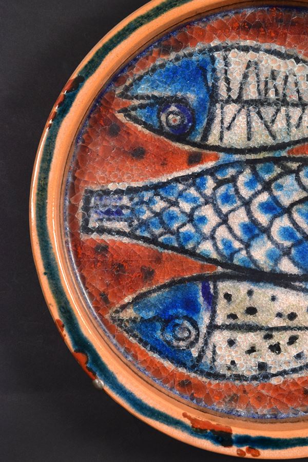 Piatto in ceramica con cristallina a grosso spessore con pesci.