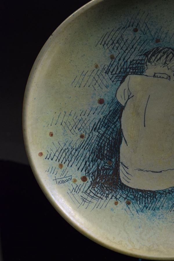 Piatto in ceramica policroma con dipinto figura di bambino seduto di spalle.