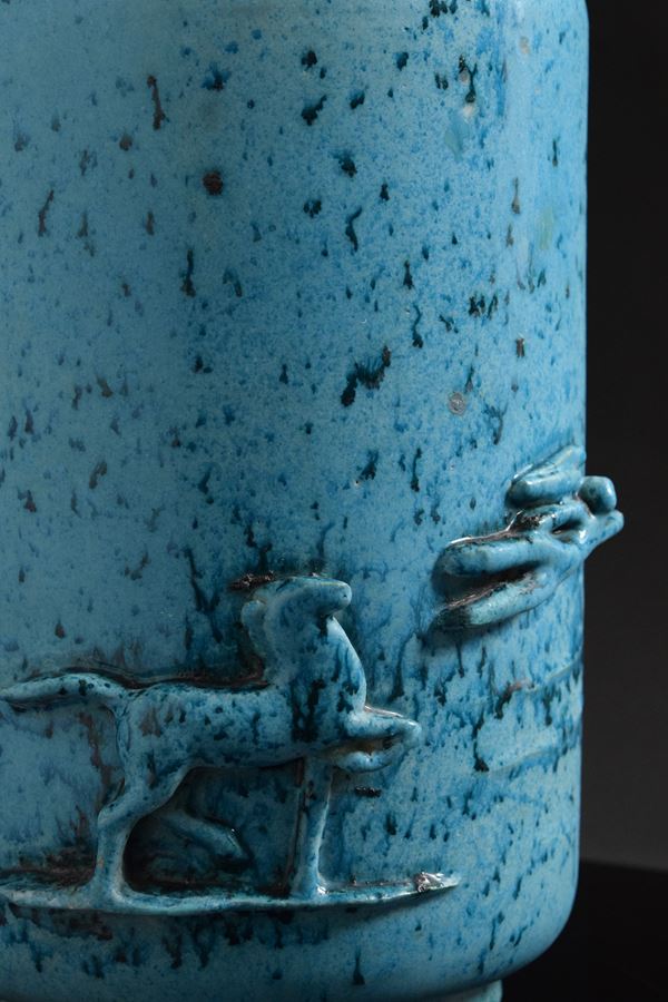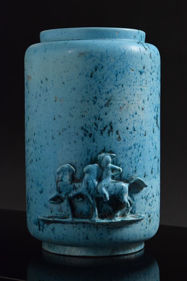 Vaso in ceramica policroma a forma cilindrica con figure applicate di cavalli e cavalieri.