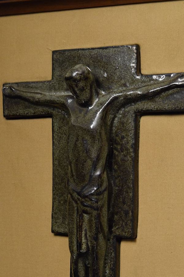 Cristo in croce in grès monocromo puntinato color salvia. Montato su pannello in legno non coevo.