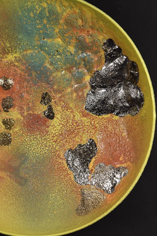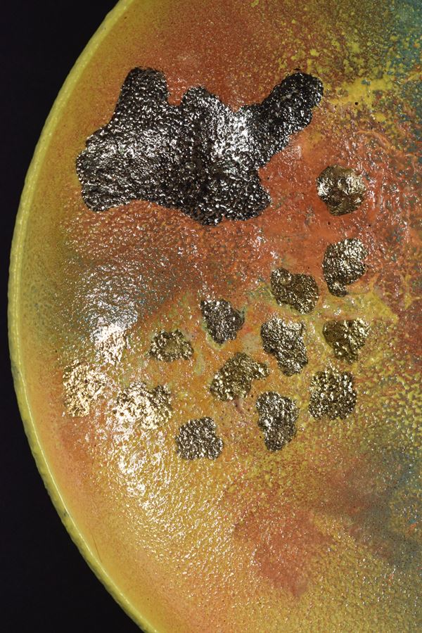 Grande ciotola in grès policromo e "macchie" di color platino e oro.