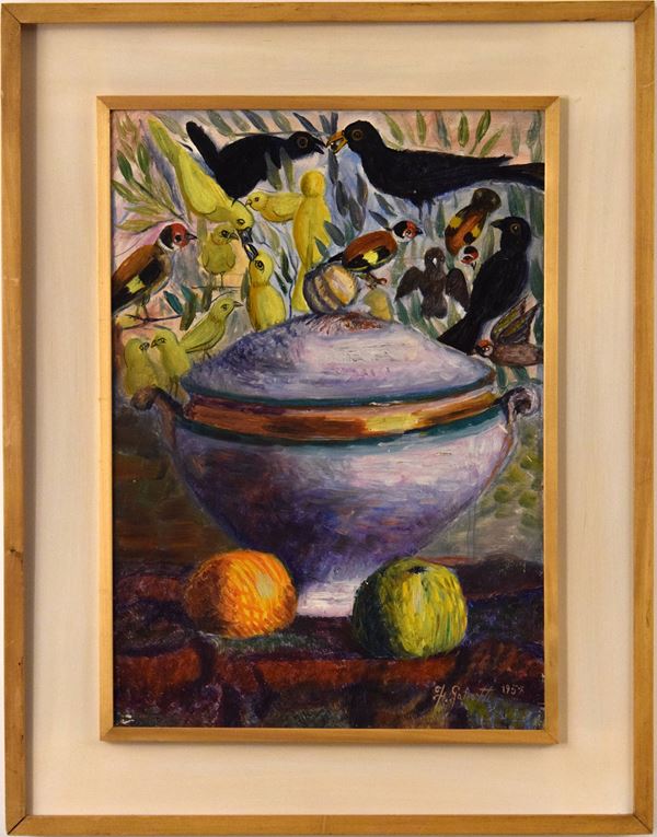 Olio su legno con grande zuppiera e frutti su tavolo, circondata da canarini e merli.