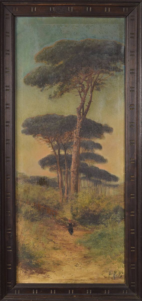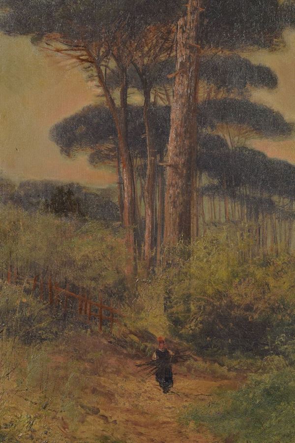 Olio su tela raffigurante scorcio di pineta con figura di donna. Cornice coeva.