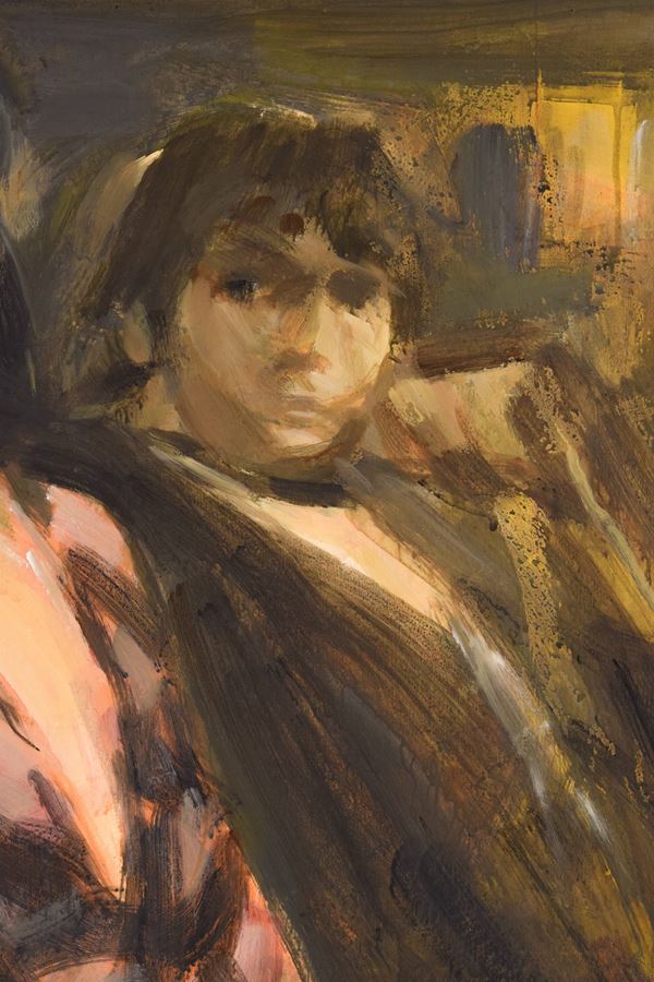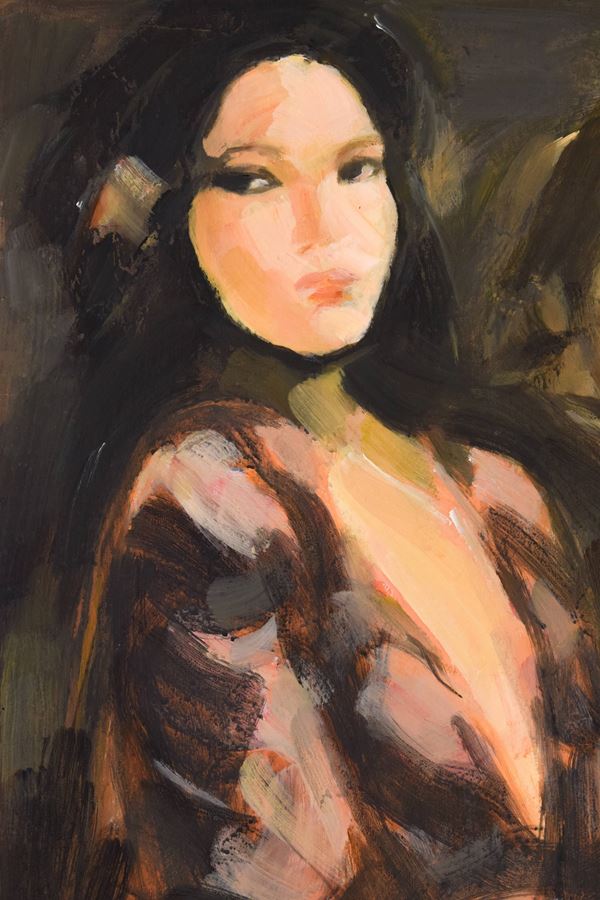 Olio su legno con modella orientale e autoritratto del pittore accanto.