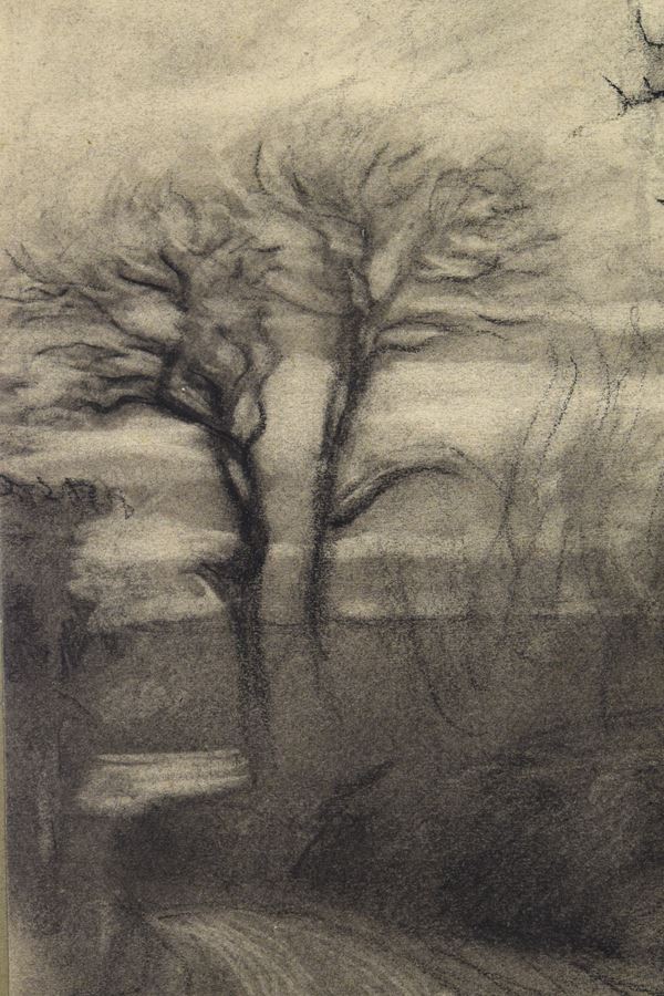 Carboncino su carta di scorcio di paesaggio invernale. Entro cornice coeva in legno di noce.