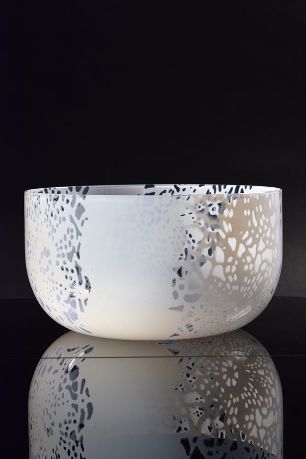 Grande coppa della serie Merletti in vetro lattimo con decori traforati.