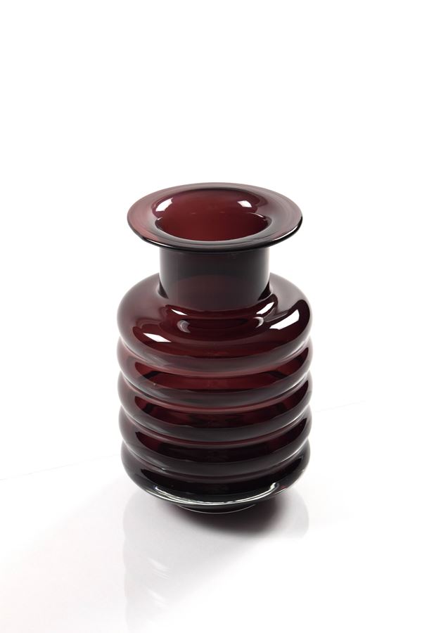 Vaso in vetro di Murano ad anelli a collo svasato color malva.
