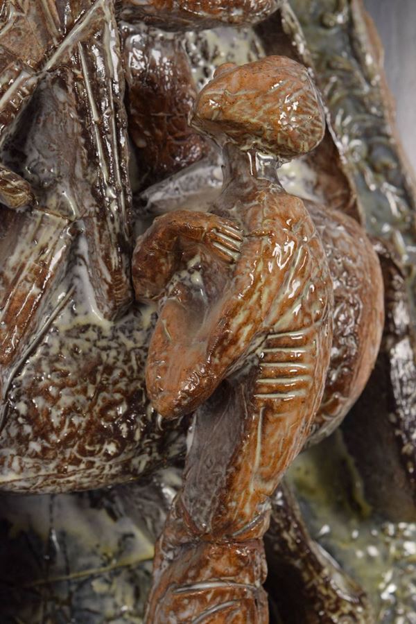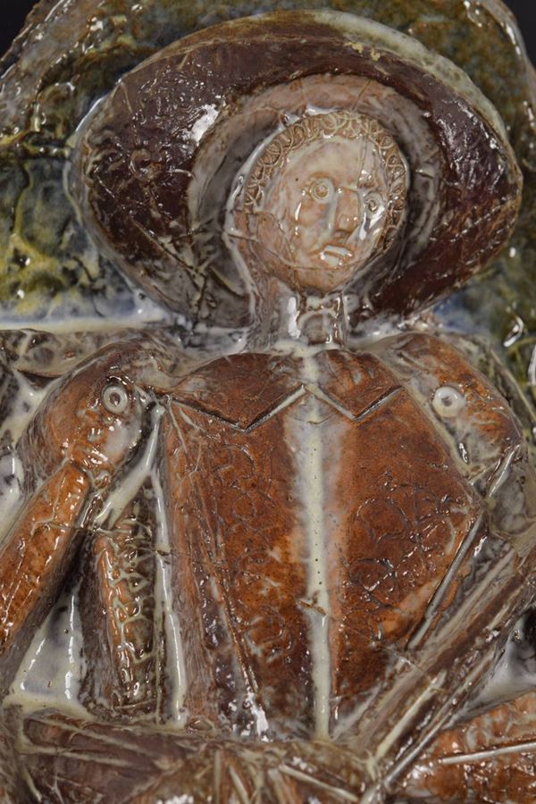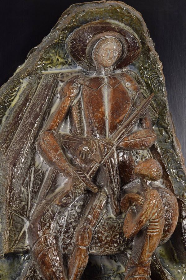 Grande altorilievo in ceramica policroma raffigurante il Santo che dona il mantello al povero, montato su pannello in legno dipinto nero coevo.