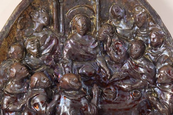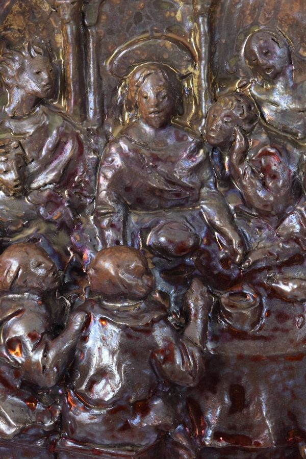 Ceramica policroma riflessata nei colori del verde e bordeaux. Raffigurante l'ultima cena con Cristo e Apostoli ad altorilievo entro un vassoio a forma rettangolare.
