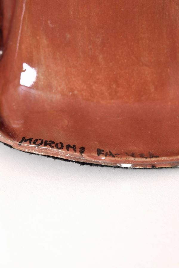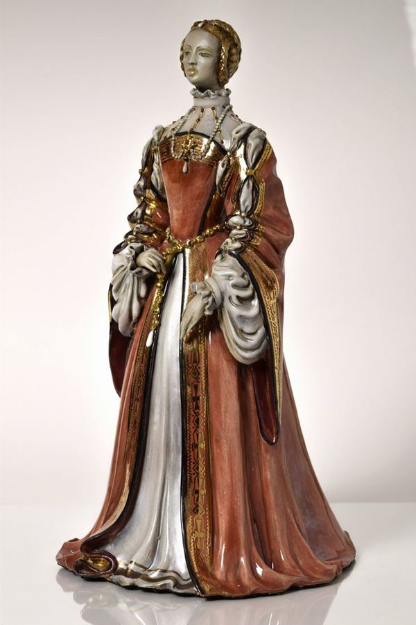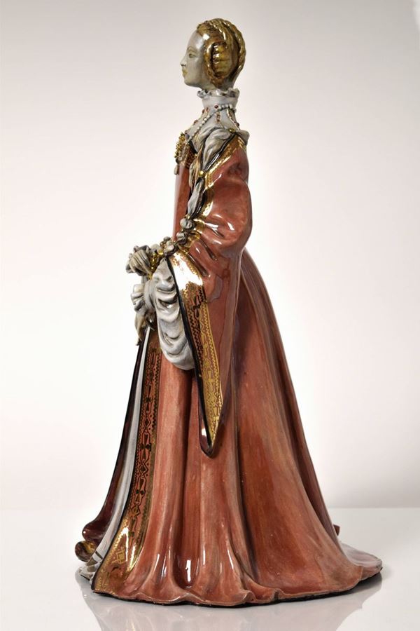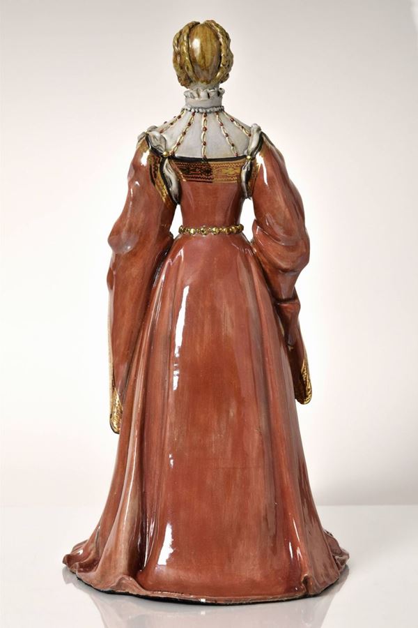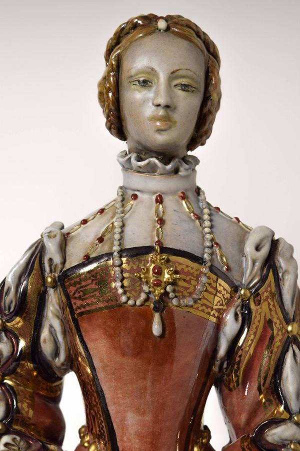 Dama in costume spagnolo del XVI secolo, in ceramica policroma con abito lungo rifinito in oro, maniche arricciate, ricchi gioielli, cintura in vita trattenuta dalla mano destra, acconciatura curata a trecce raccolte.