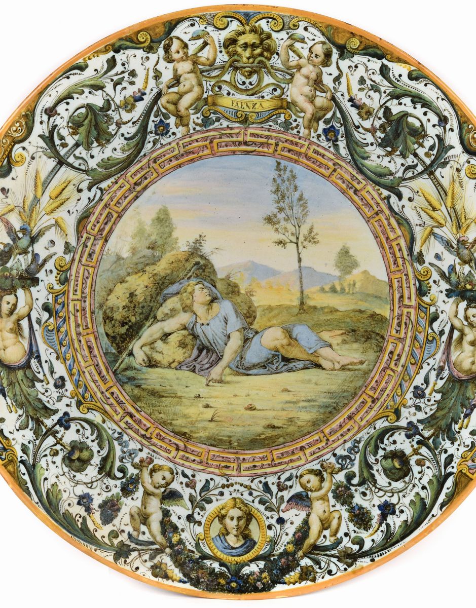 Grande piatto da parata in maiolica policroma finemente dipinto con scena mitologica "Il sonno di Rinaldo" al centro, incorniciata da una greca romana e da una tesa magistralmente dipinta con putti, figure allegoriche, mascheroni ghirlande e altri motivi vegetali e floreali. Nella parte centrale in alto è presente un cartiglio con la scritta "FAENZA" sorretto da due putti.