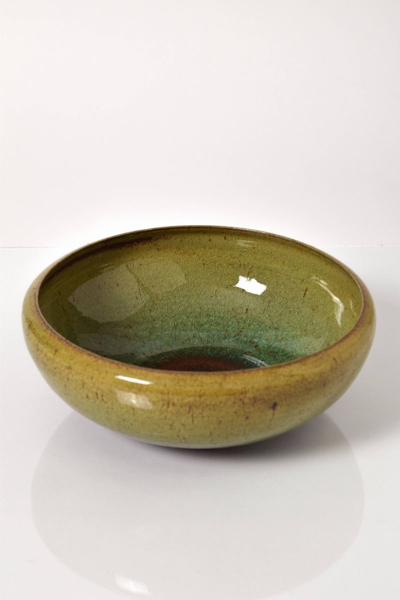 Ciotola a bordo alto in ceramica policroma con spessa invetriatura, all'interno sul fondo grande macchia di colore rosso mattone, circondata da sfumature nelle tonalità del verde.