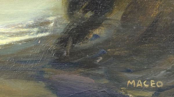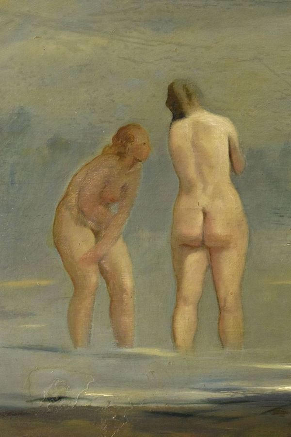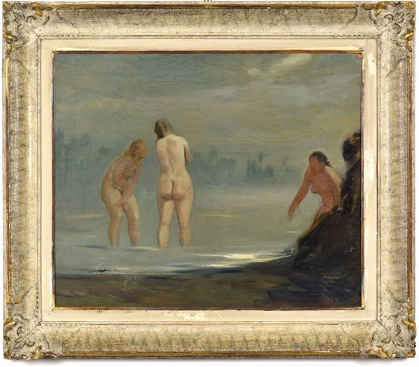 Olio su legno raffigurante tre nudi femminili mentre si lavano in riva ad un fiume nella foschia mattutina. Cornice coeva laccata avorio e oro vecchio.