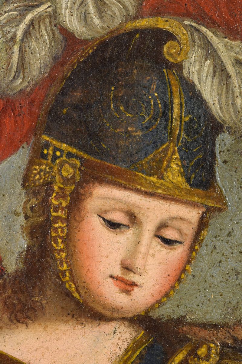 Olio su tela raffigurante Arcangelo San Michele guerriero che sconfigge il Male rappresentato da Satana. Cornice dorata non coeva.