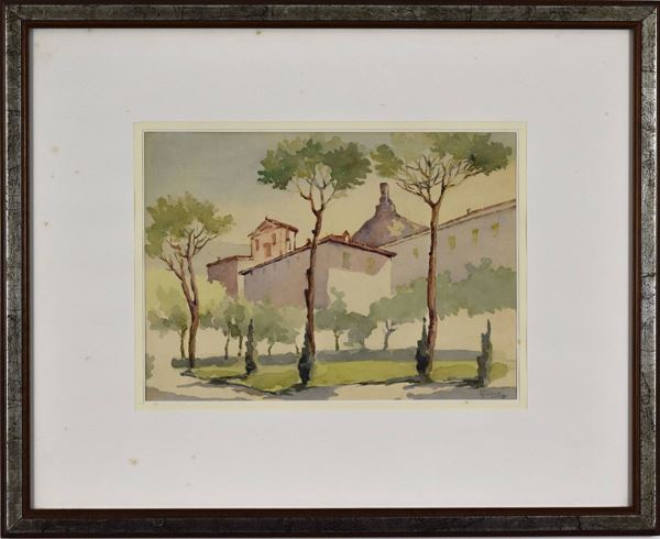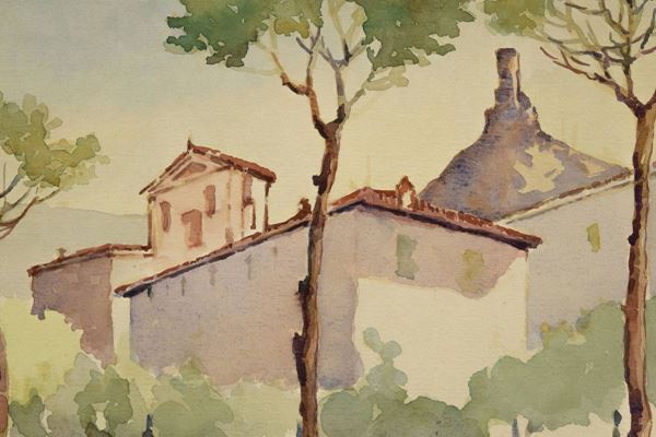Acquerello su carta con giardino e veduta di un colle di Brisighella.
