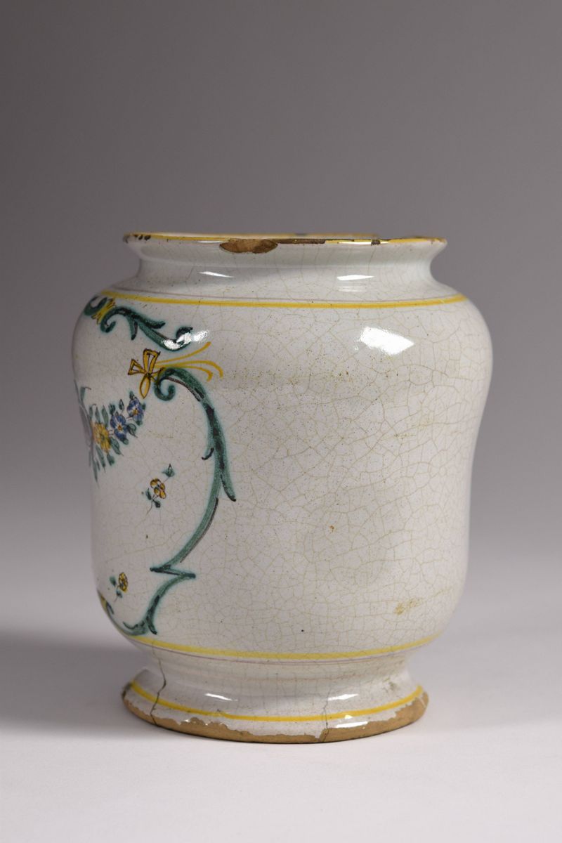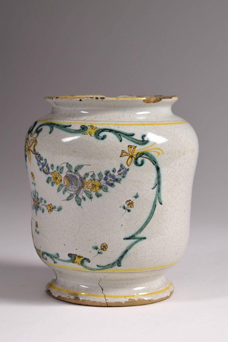 Albarello in maiolica policroma dipinta con ghirlande e nastri, nei colori del giallo, verde e blu.