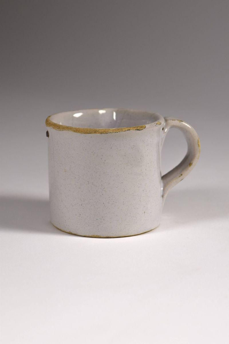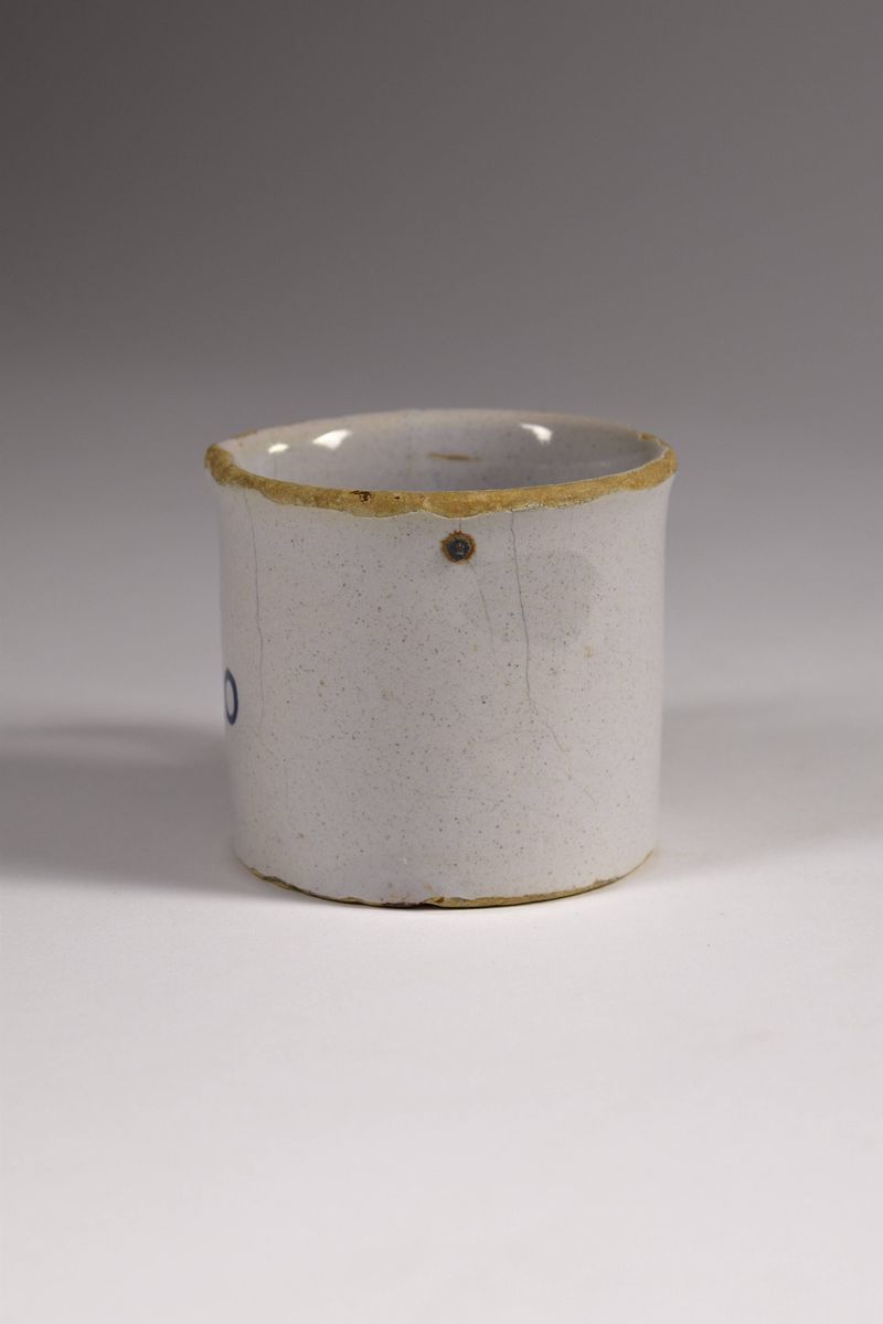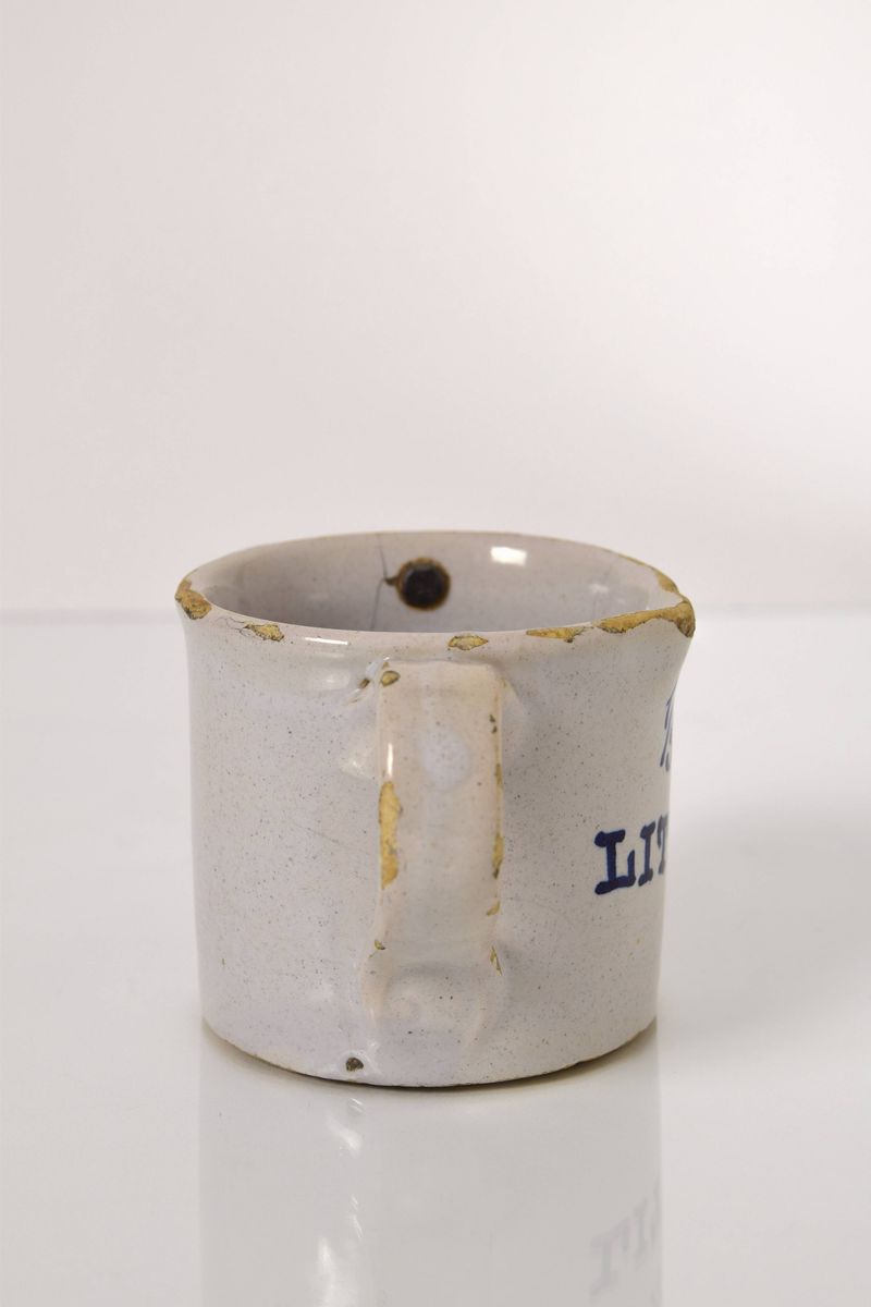 Bicchiere in maiolica bianca con scritta "1/5 litro" in blu, all'interno piombo annonario (bollo fiscale).